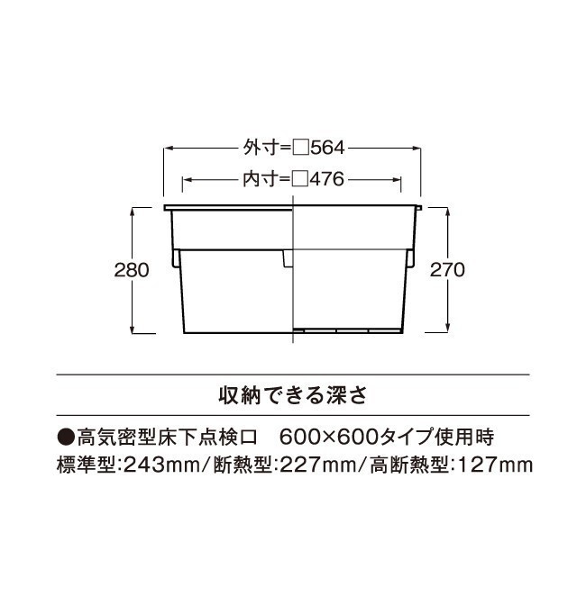 12/28~1/6迄冬期休暇です。休み明けより随時発送いたします。商品明細★床下点検口(60角)と床下収納庫(浅型)の【セット販売】です。1.【高気密型床下点検口(標準型)60角/SPF6060F12】・カラー:ブラックブラウンBB・タイプ:フローリング合わせタイプ※板厚12mm専用です。・材質:【蓋】縁材:PP 底蓋ABS 【枠】PP・床開口寸法:606×606mm・フローリング切断寸法:577.5×577.5mm2.【床下点検口用収納庫浅型/SPF60S2】・カラー:アイボリー・サイズ:564×564×280mm・材質:PP・容量/耐荷重:60L/70kg・※「寒冷地高断熱型」には使用できません送料詳細・送料無料・沖縄・離島には発送することができません。ご了承ください。重ねて発送いたします。返信・発送詳細できるだけ早いご対応を心掛けておりますが、土日・祝日やGW・夏季休暇・年末年始等の連休時は、メールのご返信と発注・発送作業ができません。何卒ご了承頂けますようお願い致します。