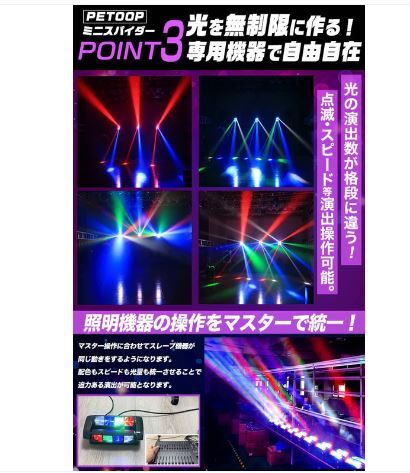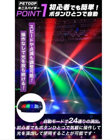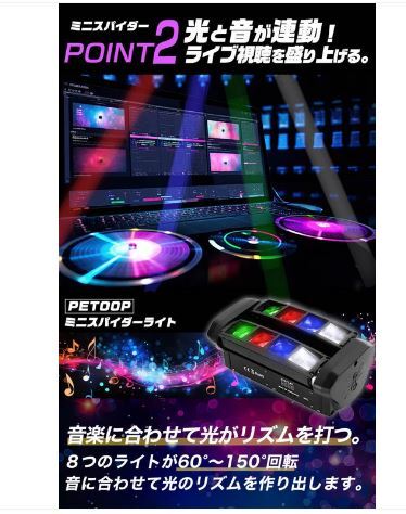 舞台の演出にピッタリのPETOOP製の「ミニスパイダーライト」やで。音に合わせて光が踊るみたいに動くから、ライブとかイベントでめっちゃ使えるLEDライトやねん。