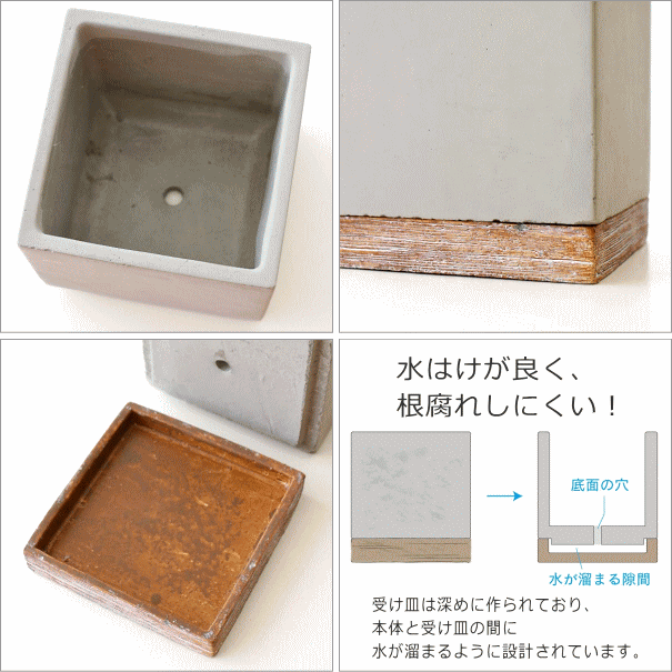 | ずっしりと重みのある バイカラーのセメントプランターは ナチュラルモダンな雰囲気が漂う 洗練されたデザイン ウッド調の加工を施した深めの受け皿で 水捌けがよくなるような工夫がされているので 根腐れ防止になり、 湿度の高い環境を嫌う 多肉植物やサボテンとも相性抜群です 幅が14cmのスクエアタイプです 商品名 : バイカラーセメントプランター スクエア 商品番号 : spc5270 全体サイズ(cm) : 幅14×奥行14×高さ15 プランター内サイズ : 幅12×奥行12×深さ12 材質 : セメント 重量 : 1.8kg 生産国 : 中国 ※底穴が開いています ※ペイント斑や小傷、小さな欠け、汚れなどをわざとつけてアンティークを模した商品です ※素材の特性上、セメントの破片や、塊、斑、凹凸、ガタつき等が見られます ※ディスプレイによる色の違いはご了承下さい |
