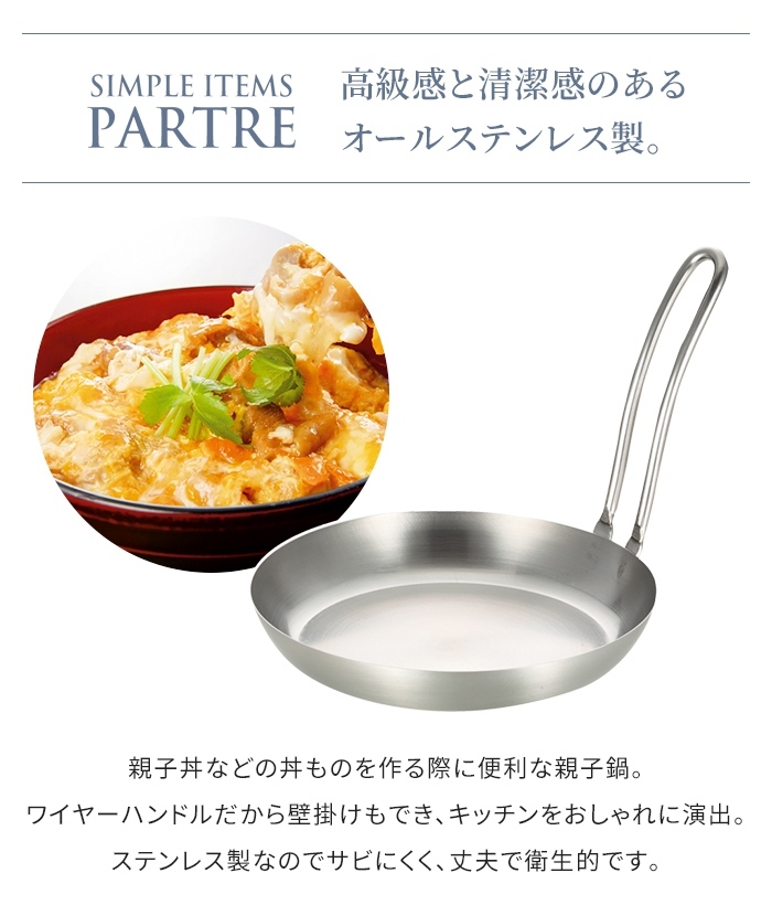 | オールステンレス製 親子丼鍋 16cm IH対応 ガス火対応 オール熱源 丼用フライパン 便利グッズ 調理器具 料理 シンプル 鍋 ステンレス 親子鍋 片手鍋 小鍋 ワイヤーハンドル オール熱源対応 調理道具 壁掛け可 コンパクト お手入れ簡単 キッチン用品 親子丼 丼もの キッチン 台所 |