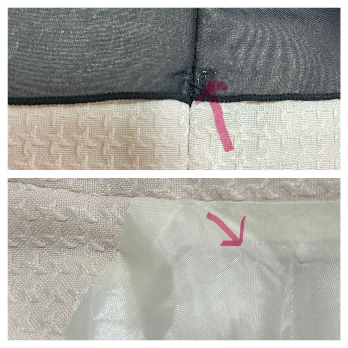 また写真9枚目の上のようにワンピース部分に小傷があります。そこの部分がちょうど縫われている箇所なので、もしかしたら製造過程で出来てしまったものではないかと思います。そして写真9枚目の下のようにジャケットの裏地にハンガーで出来てしまったツレが1箇所あります。両方とも目立つものではありませんがご確認の上ご購入ください。