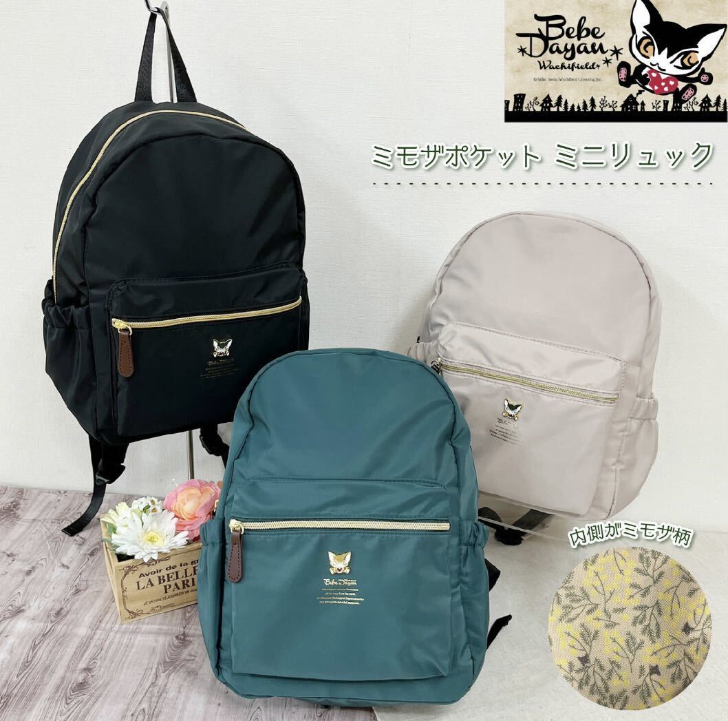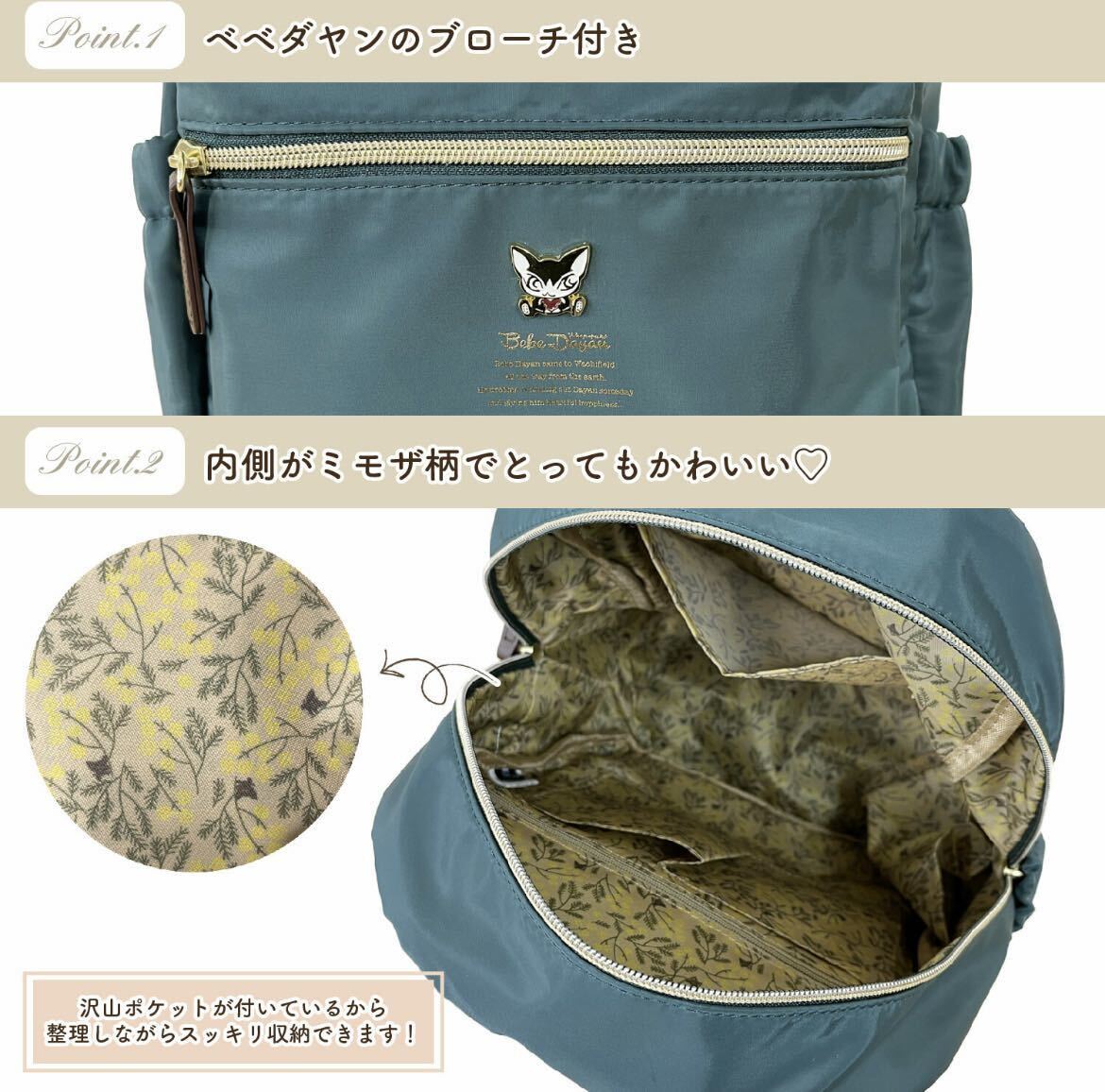 可愛い猫のキャラクターが大人気!ベベダヤンの、内側がミモザ柄になっている可愛いミニリュックです。