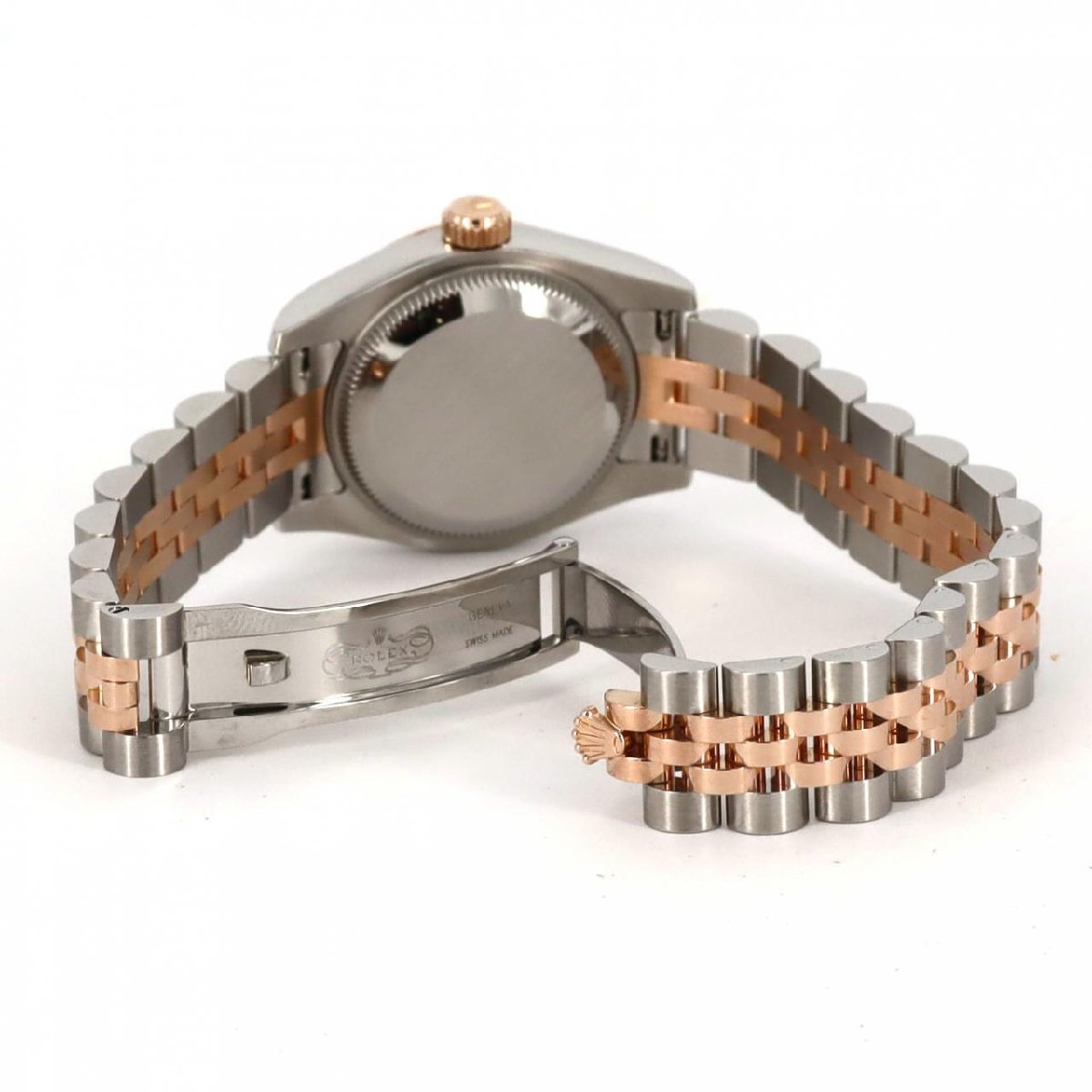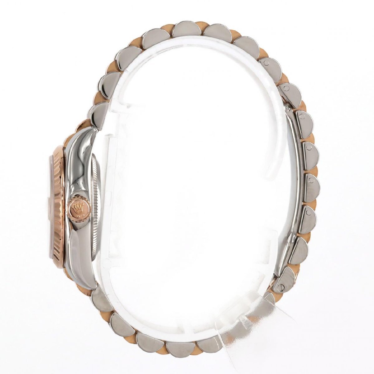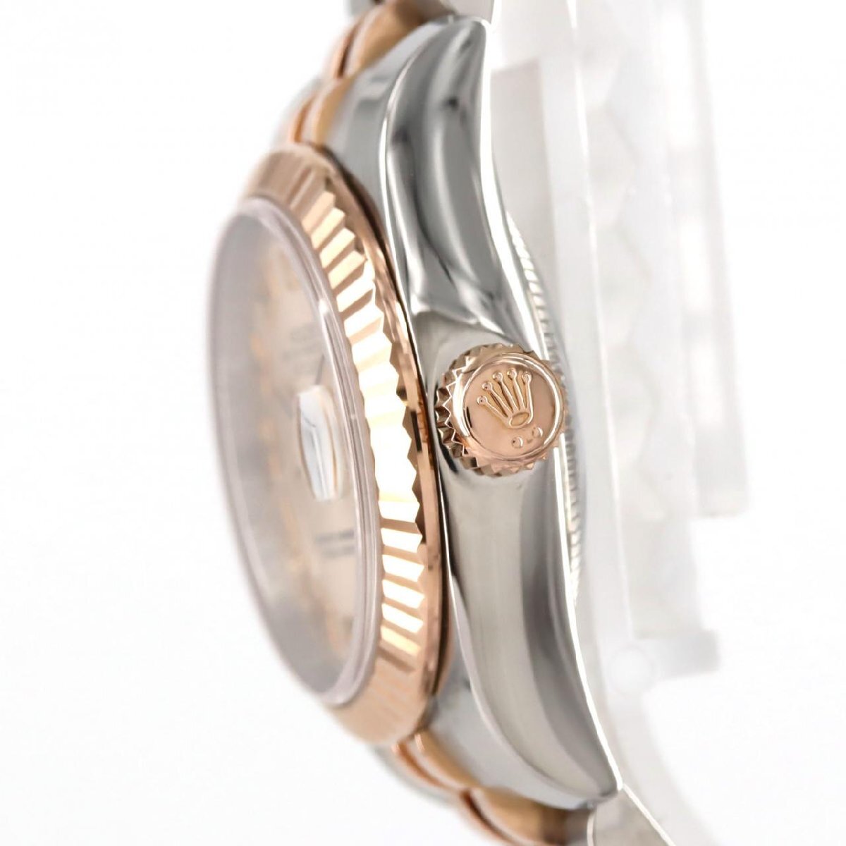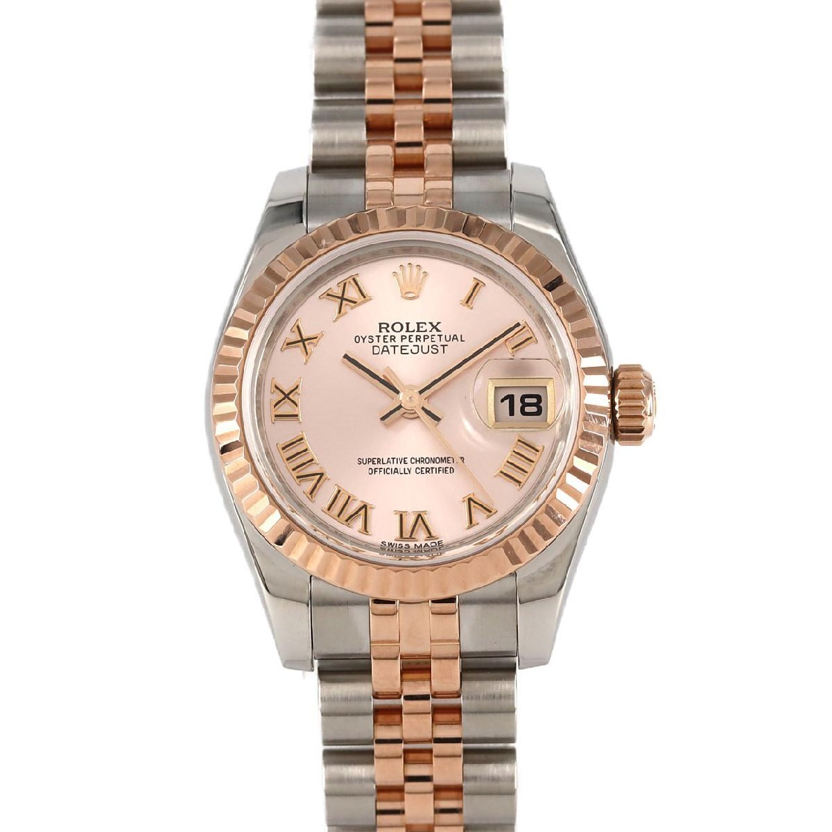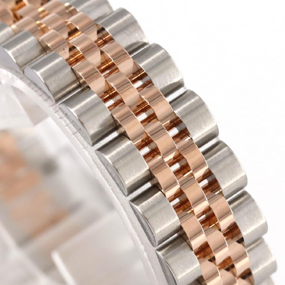 1945年に登場して以来、ロレックス伝統のモデルとして存在する「デイトジャスト」。防水ケース・自動巻ムーブメント・日付表示機能を備えており、まさに時計史に残る実用高級時計の金字塔モデルです。こちら女性用デイトジャストは、女性用ロレックスの最定番モデルで、文字盤や素材の豊富なバリエーションが魅力です。こちらは肌なじみのいいピンクゴールドとのコンビモデル。ピンク色の文字盤が女性らしい柔らかさと華やかさな印象です。