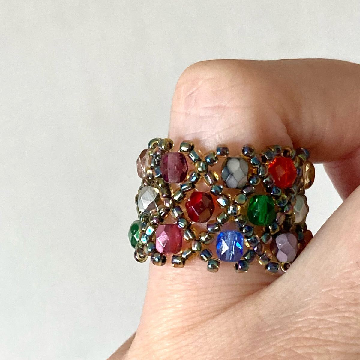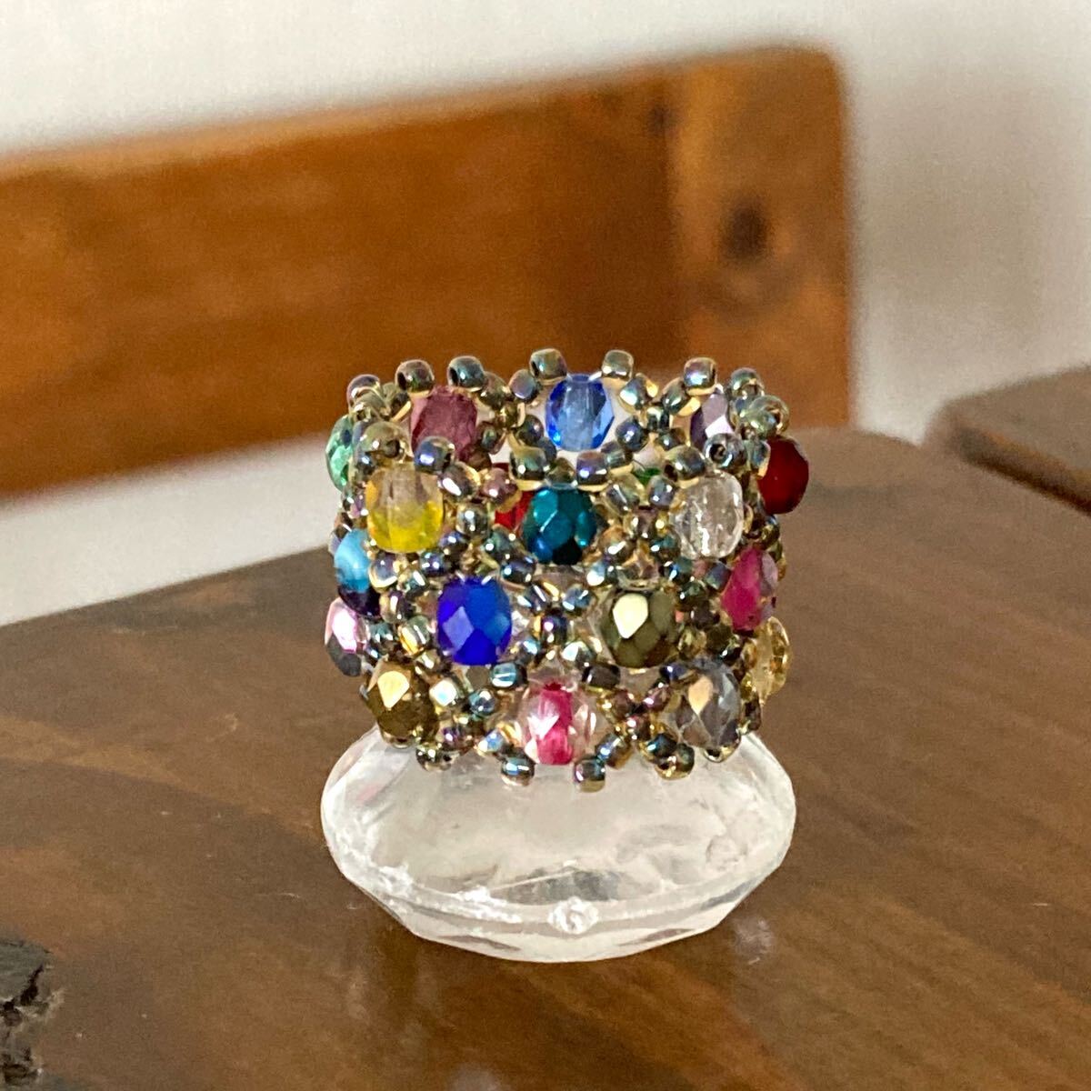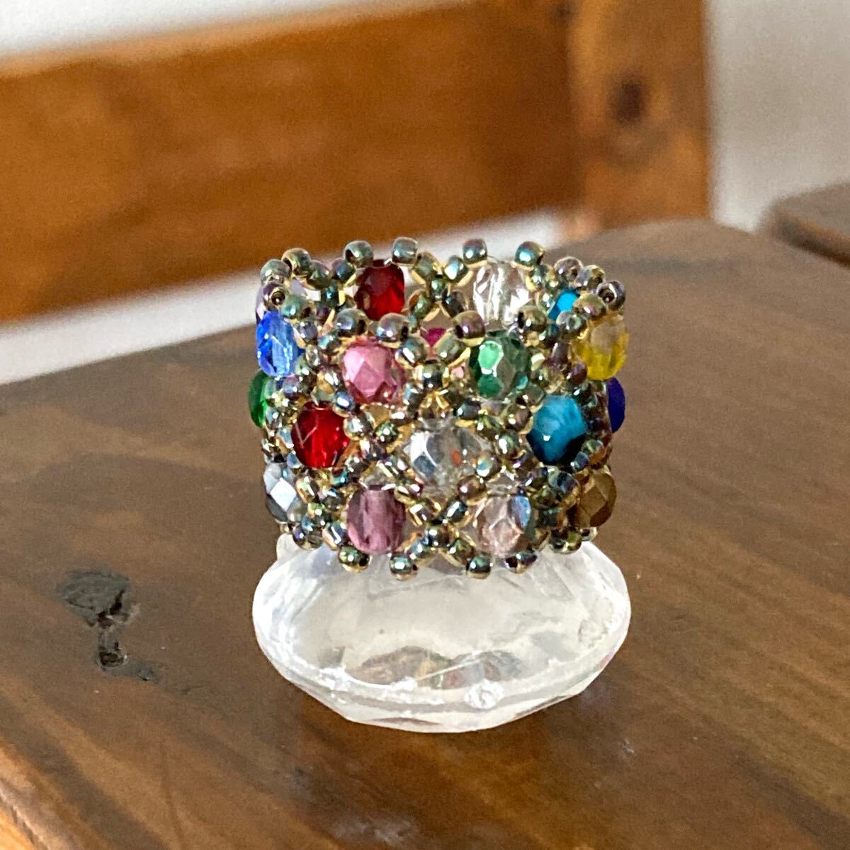 4mmのカラフルなチェコビーズ、グリーンオーロラのスリーカットビーズで作ったリングです。
