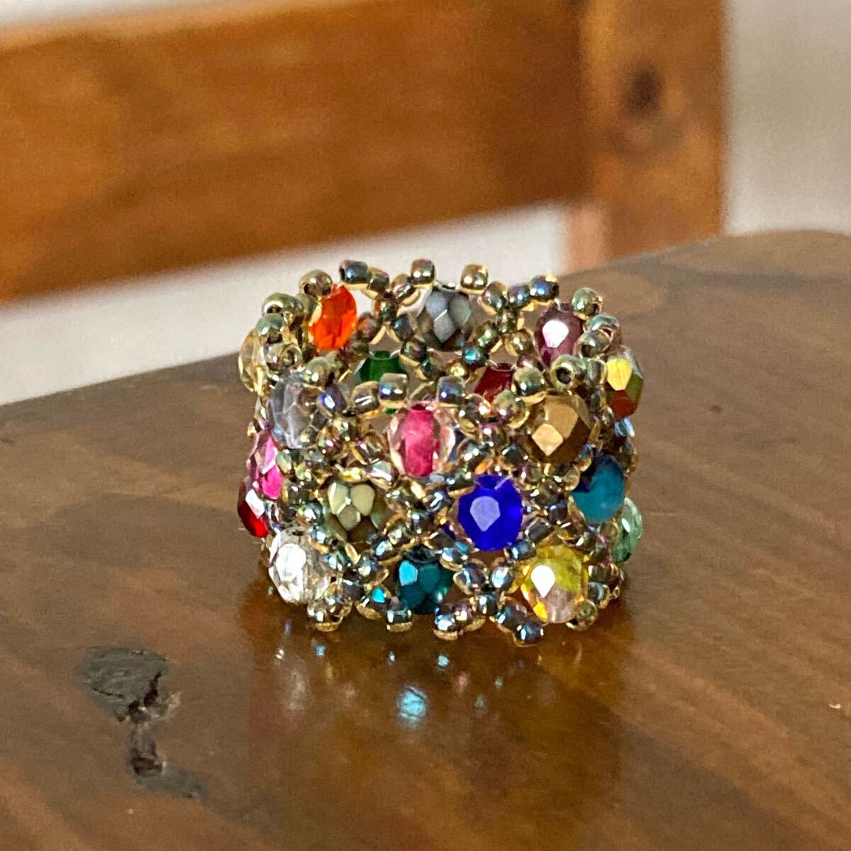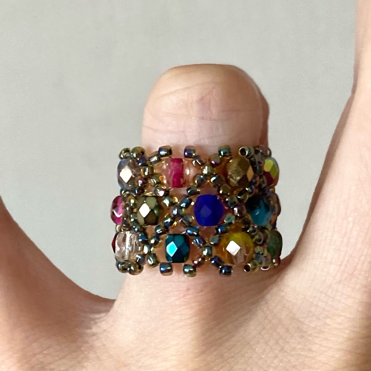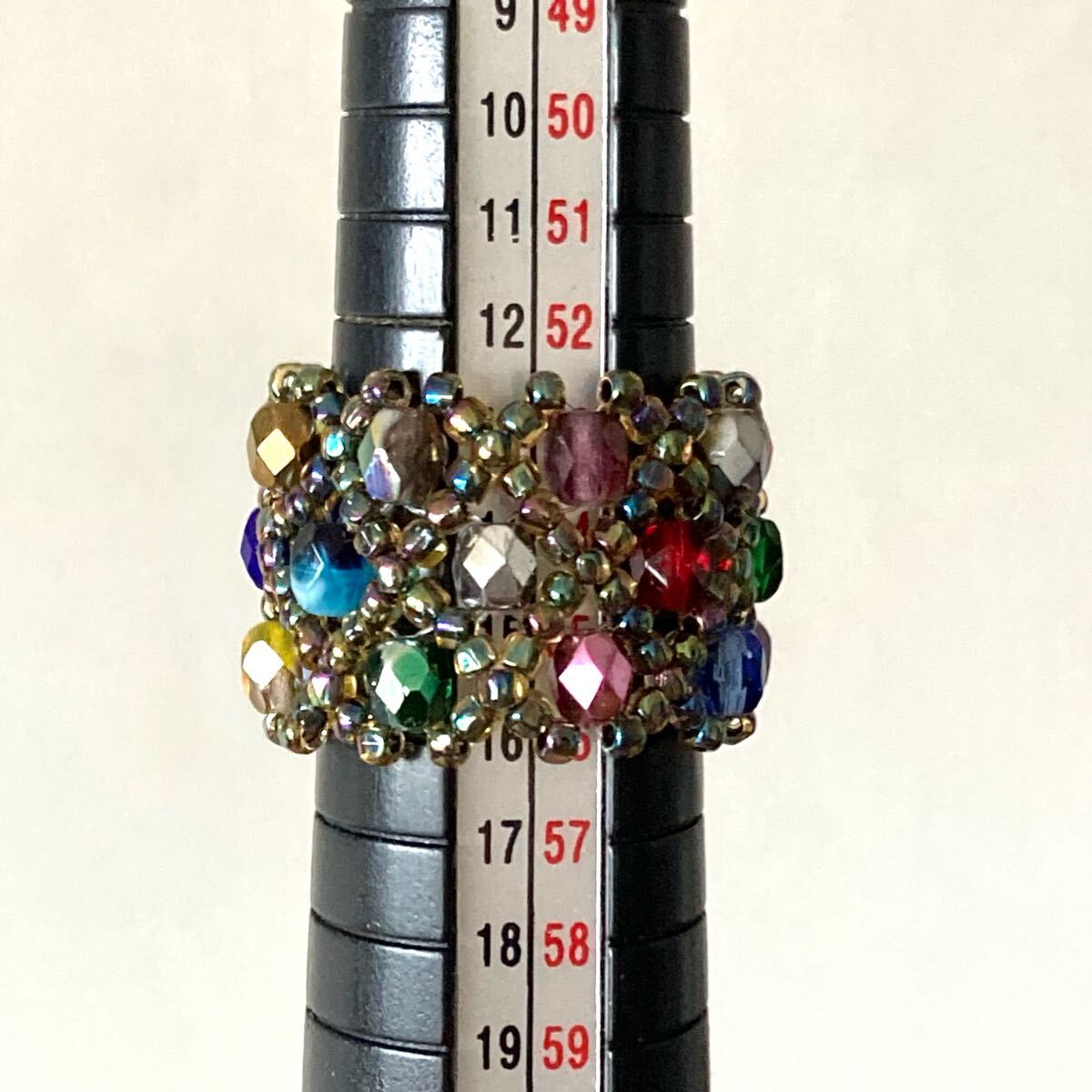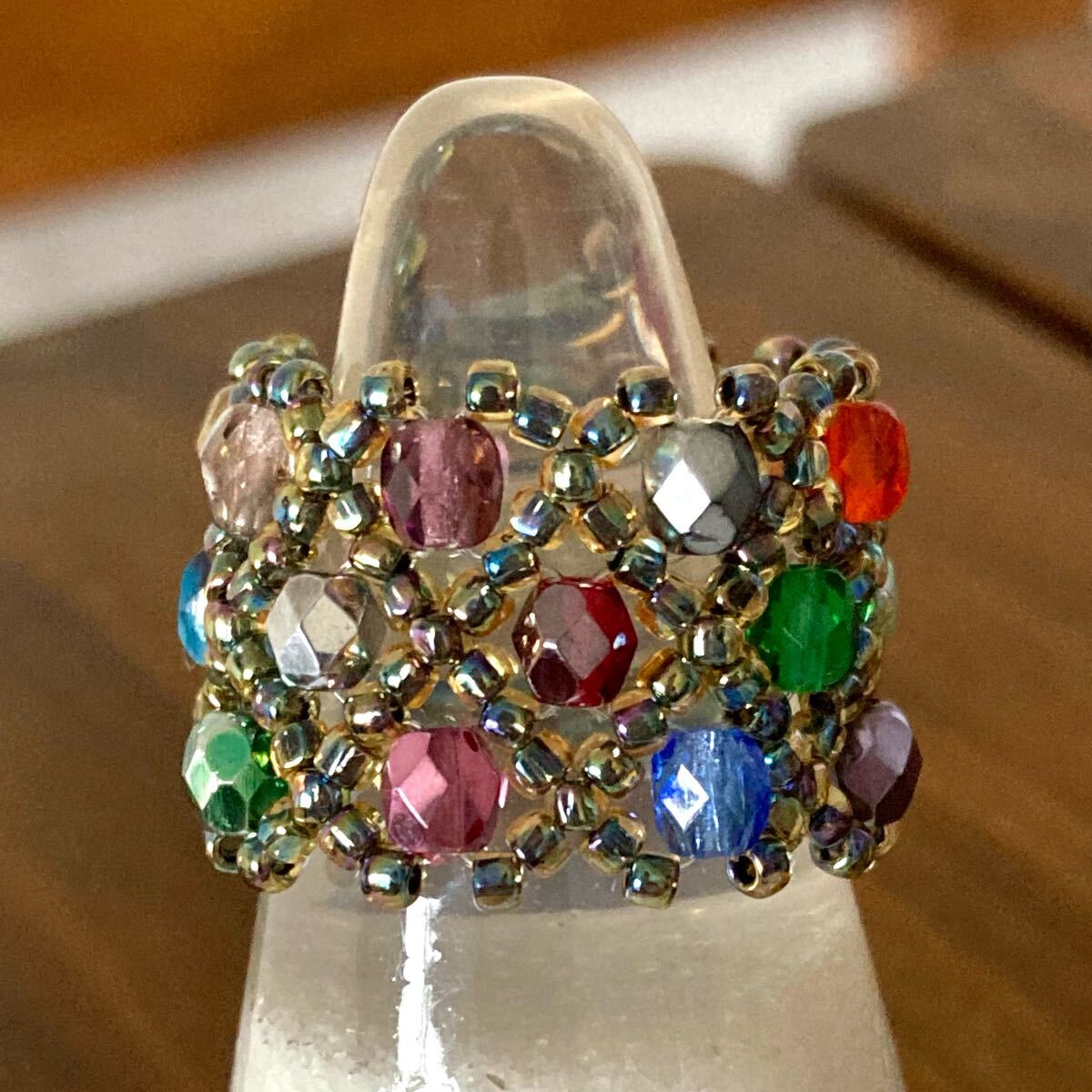 4mmのカラフルなチェコビーズ、グリーンオーロラのスリーカットビーズで作ったリングです。