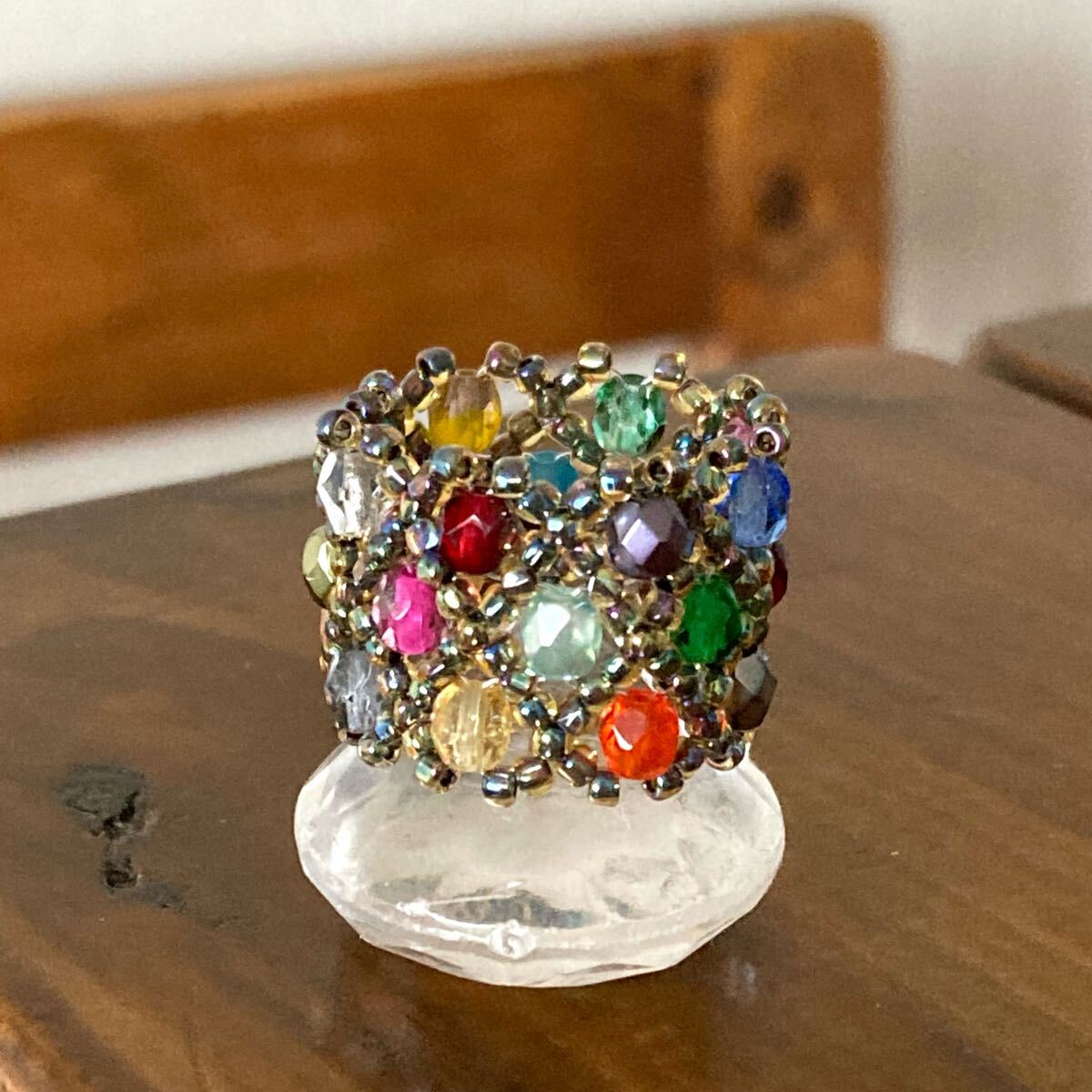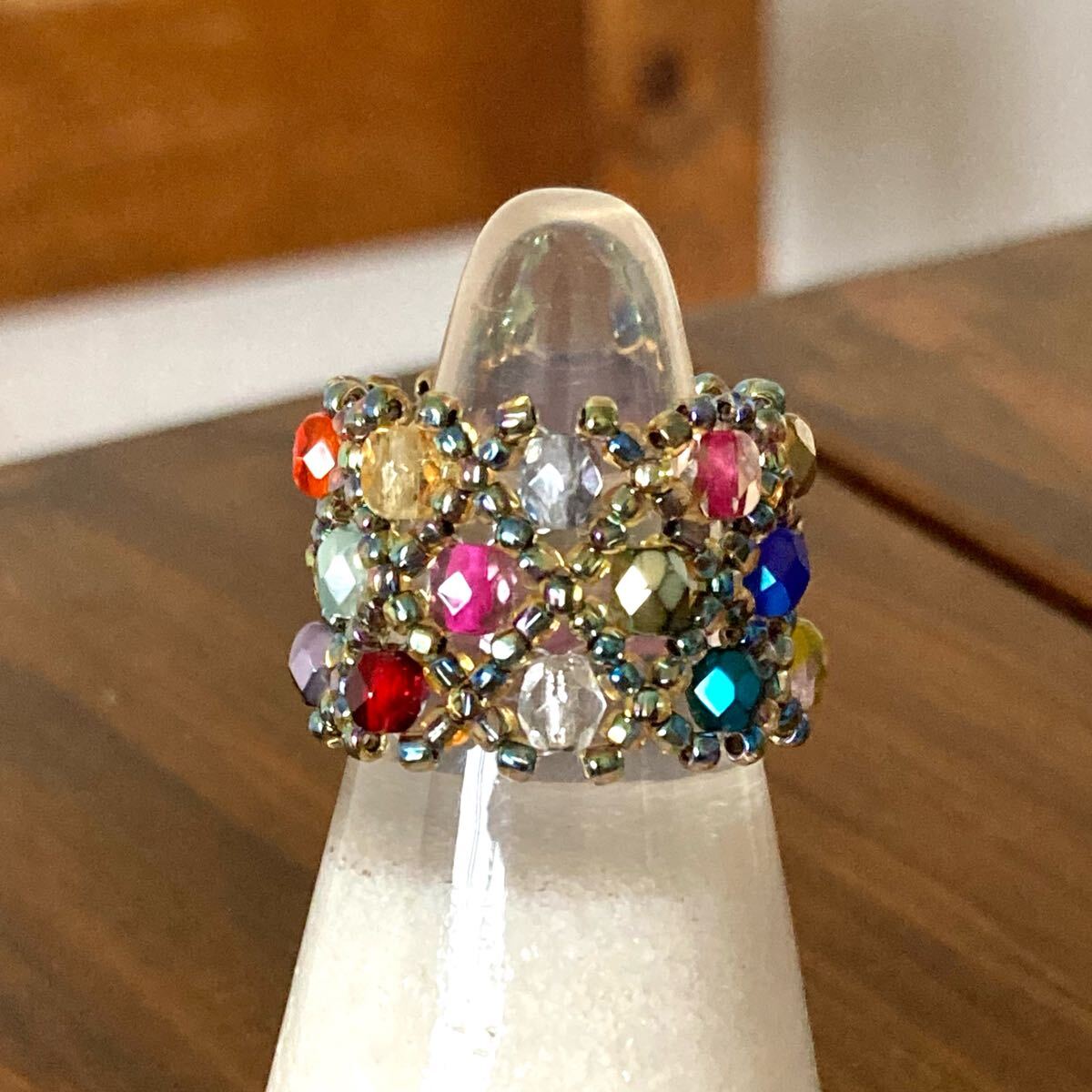 13-15号 ビーズ リング アーガイル編み カラフル×グリーンオーロラ