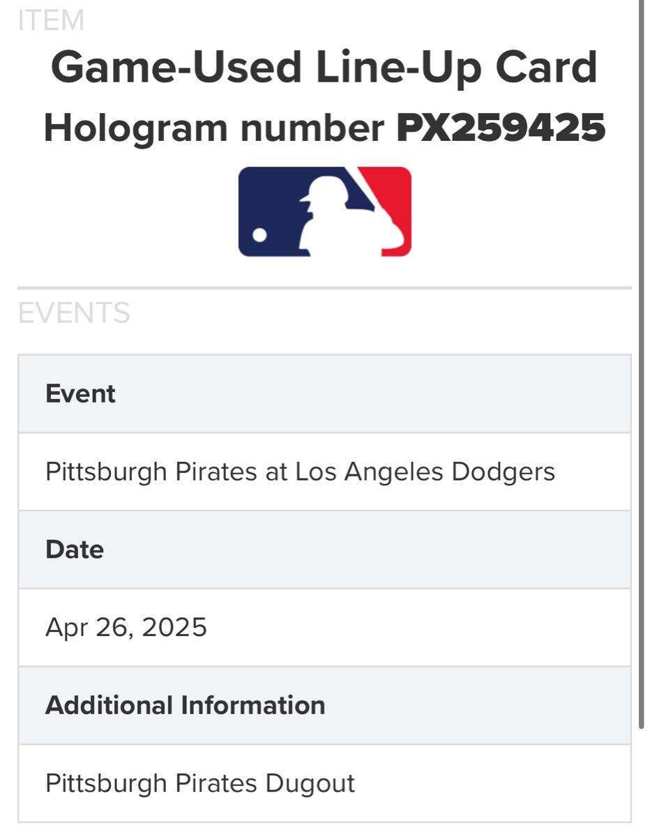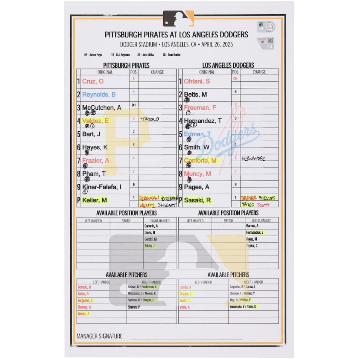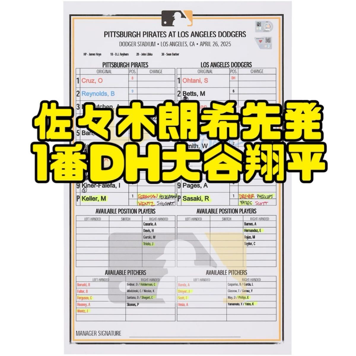 佐々木朗希先発、大谷翔平が出場した2025年4月27日(現地時間26日)のラインナップカードです。