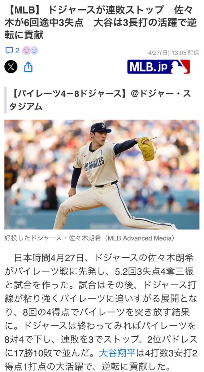 この日は佐々木朗希ドジャース6度目の先発出場、6回二死から死球を許したところで降板。5.2回を投げて5安打2四球4奪三振3失点の内容。