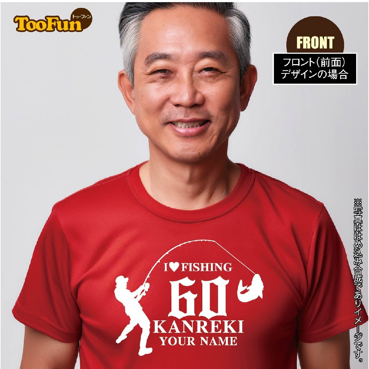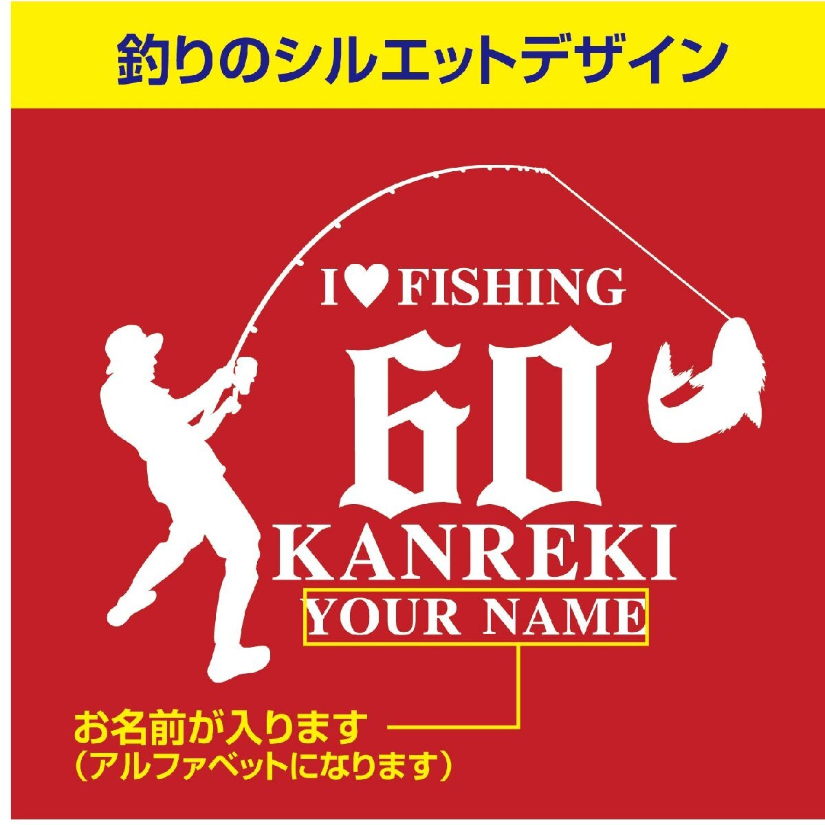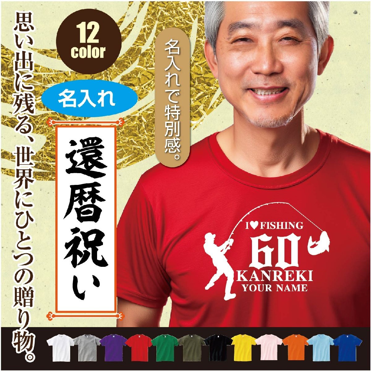 釣りのシルエット、還暦のお祝いとして名入れができる半袖Tシャツです。お色が12色、サイズも15サイズとお子様から大人までお揃いでも着用ができる仕様です。
