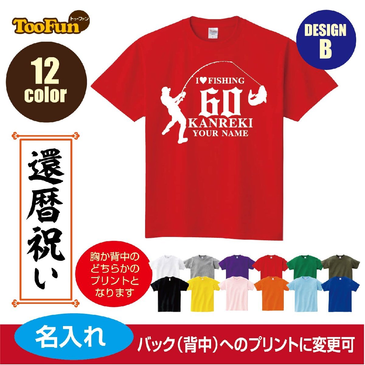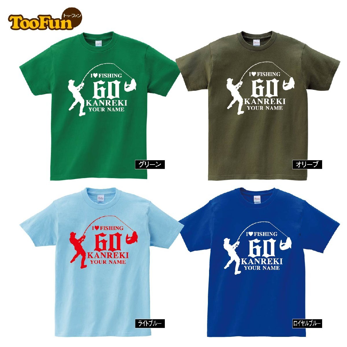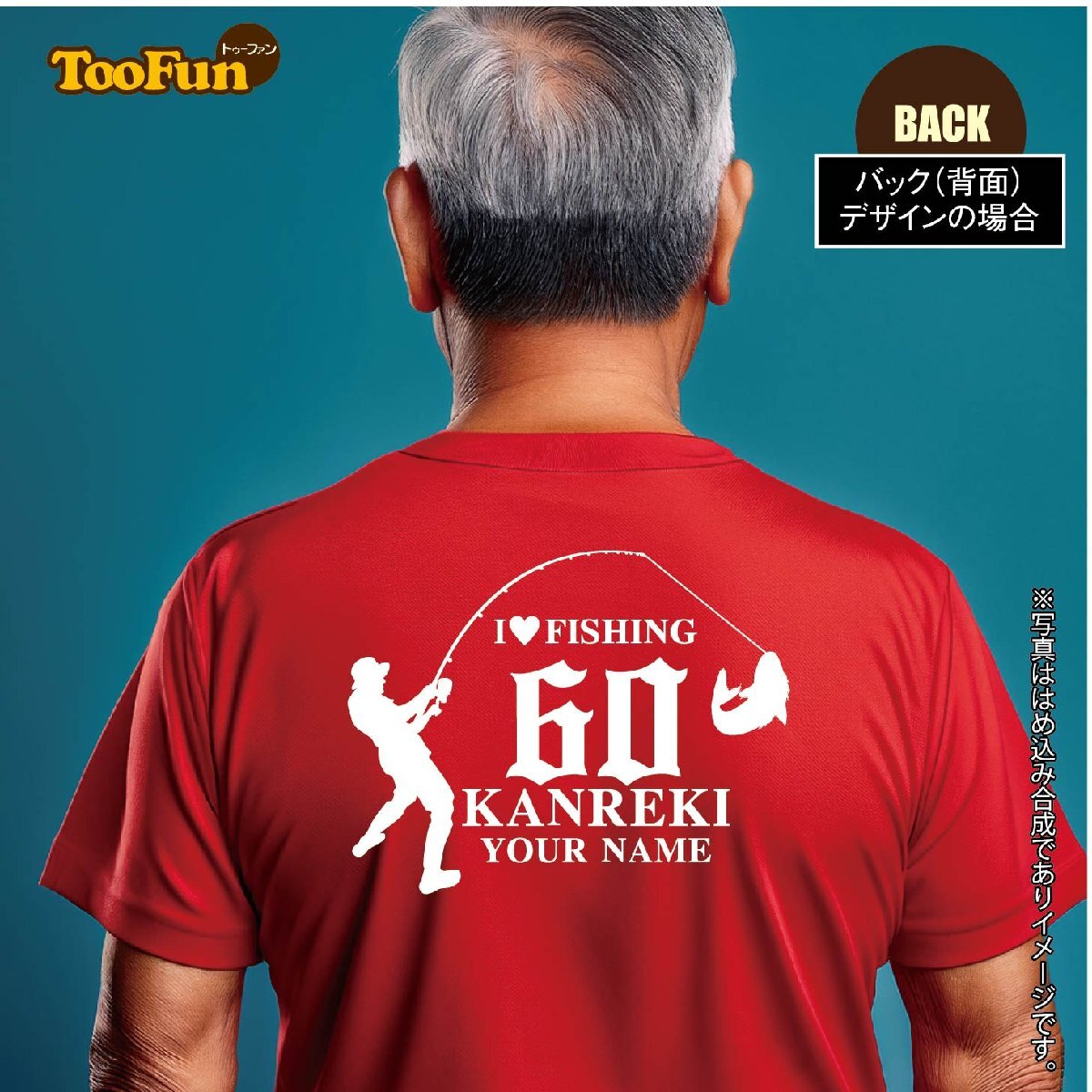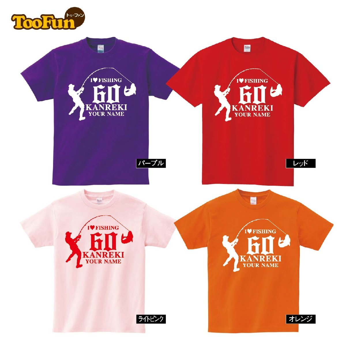 釣りのシルエット、還暦のお祝いとして名入れができる半袖Tシャツです。お色が12色、サイズも15サイズとお子様から大人までお揃いでも着用ができる仕様です。