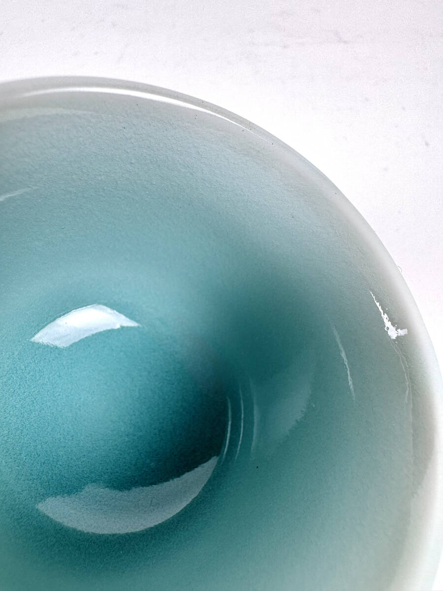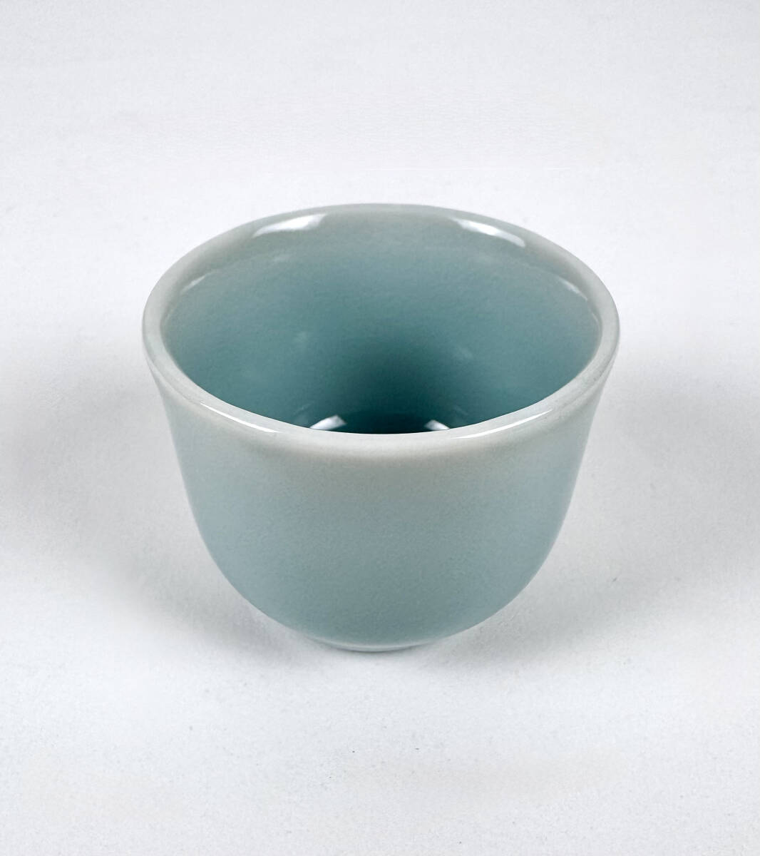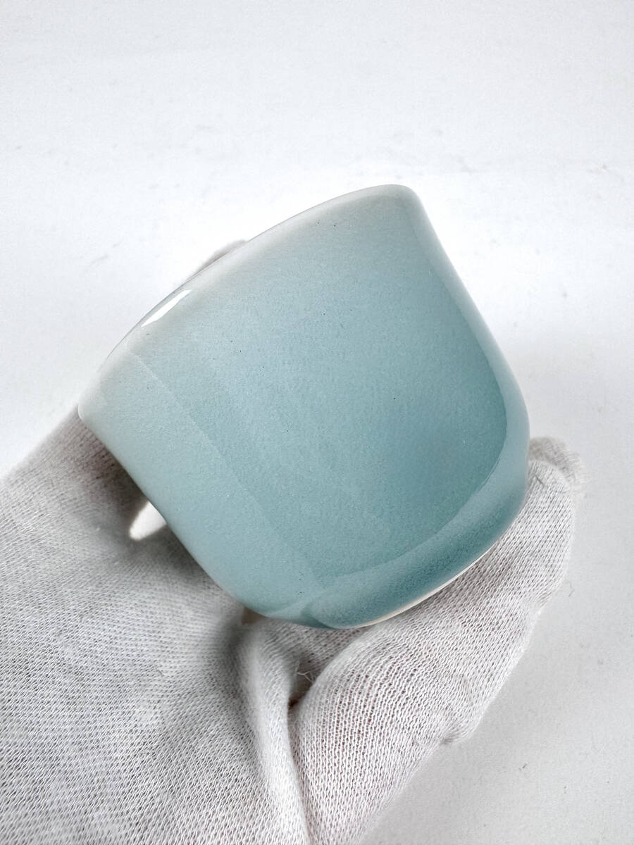 天然の青磁釉を使うことで、美しい光沢と潤いを生みだし、釉薬を厚くかけて本焼きすることで生まれる澄み切った色調が魅力の酒杯です。