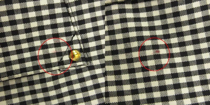 【状態】この商品には下記のようなダメージがあります。 ・首回り薄汚れあり(8枚目画像参照) ・フロント裾あたりにシミあり(8枚目画像参照) ・フロント右ポケット付近に口紅のような赤い汚れあり(9枚目画像参照) ※全体的に中古品としての使用感と上記のようなダメージがありますが、通常使用には支障のない商品です。 掲載写真や記載内容をご確認いただき、ご理解の上ご購入ください。