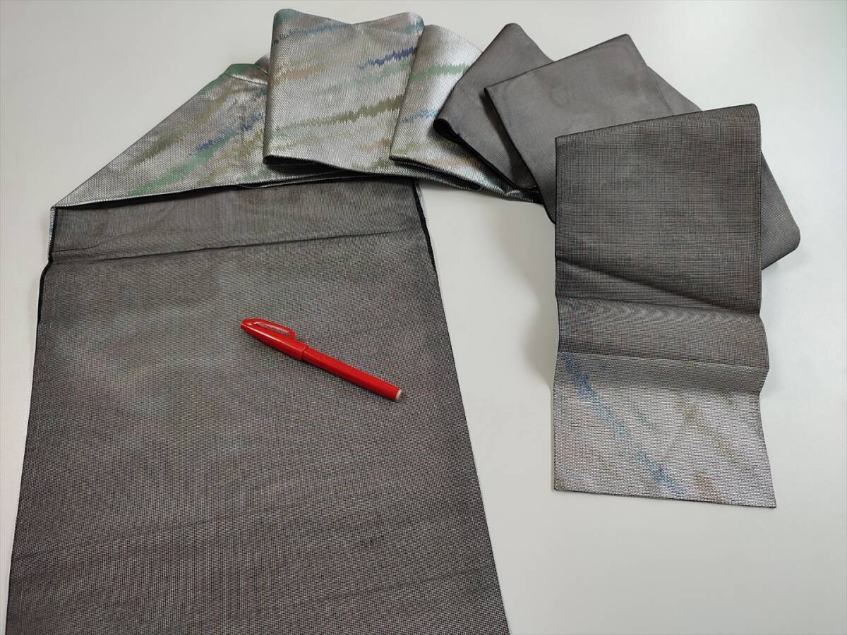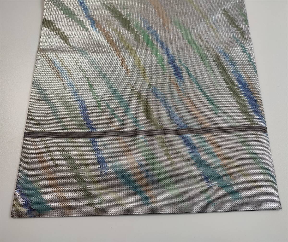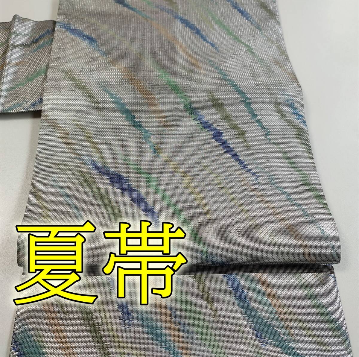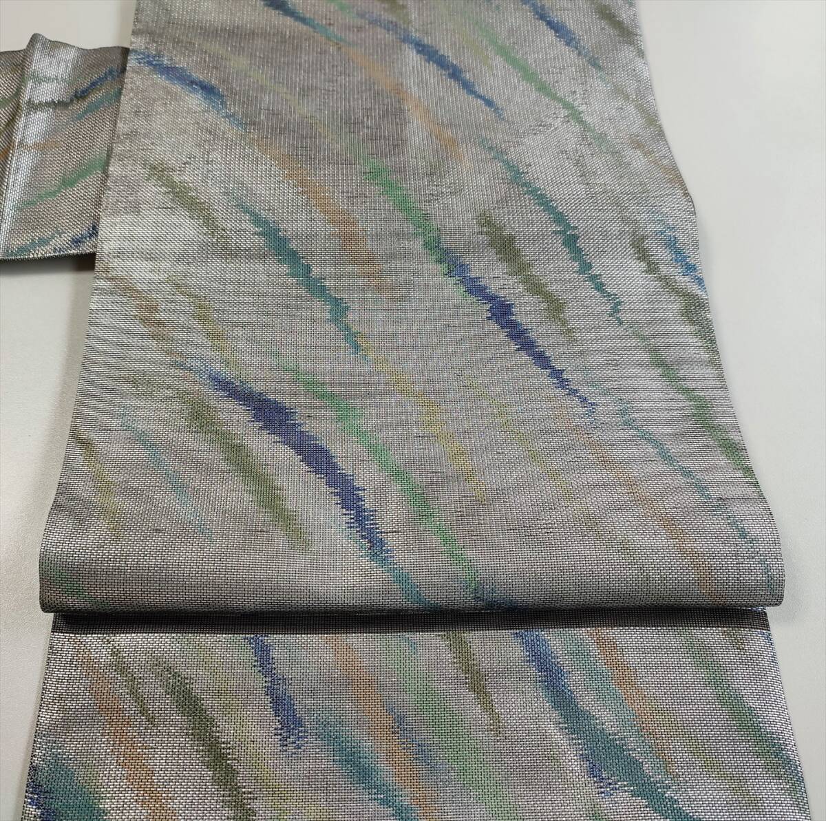 即決■着物の越田■幅30.5長さ351 正絹 名古屋帯 夏帯 名古屋仕立て シルバー 抽象柄 六通 ■ふ08J04a