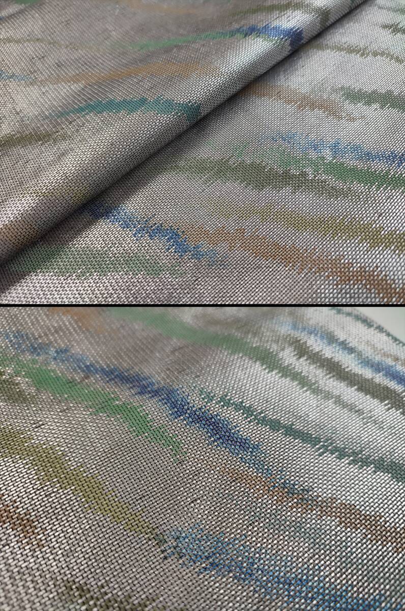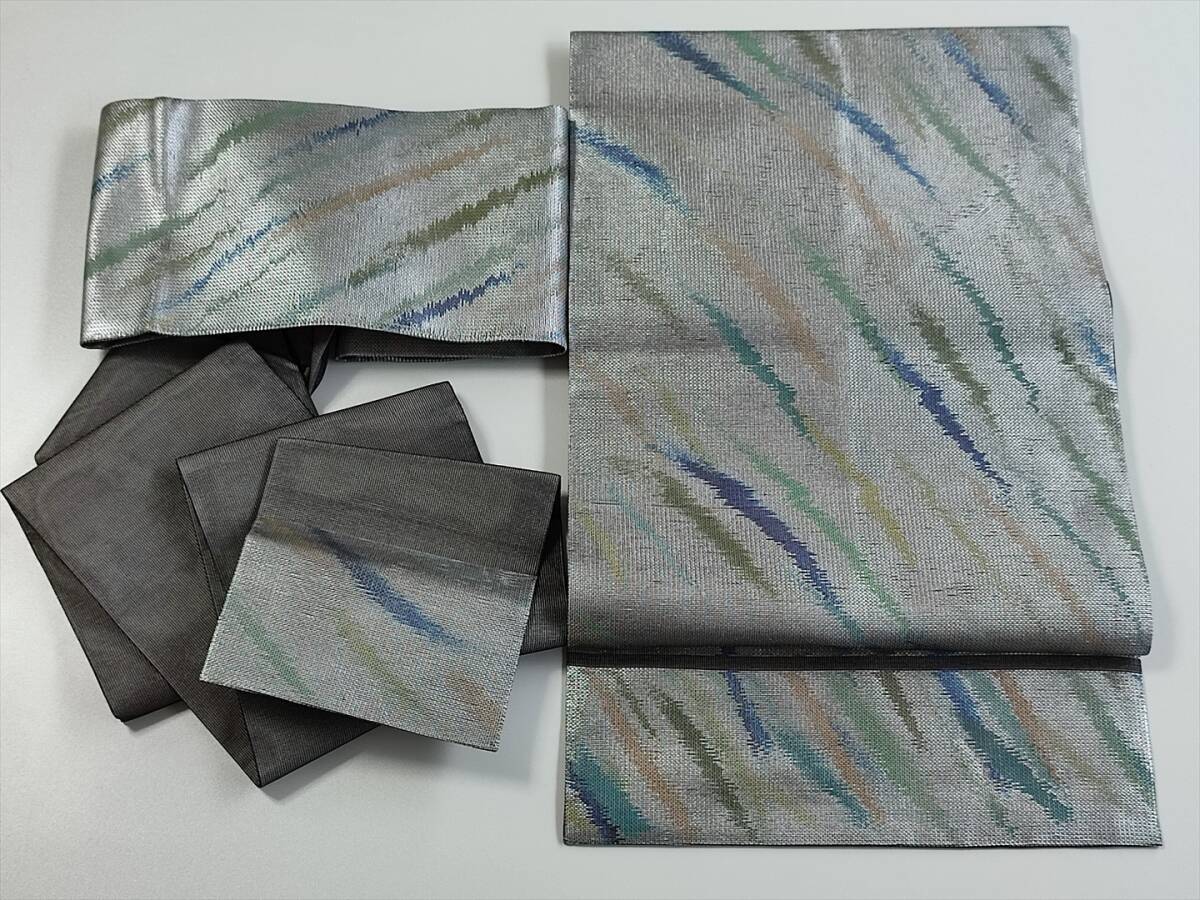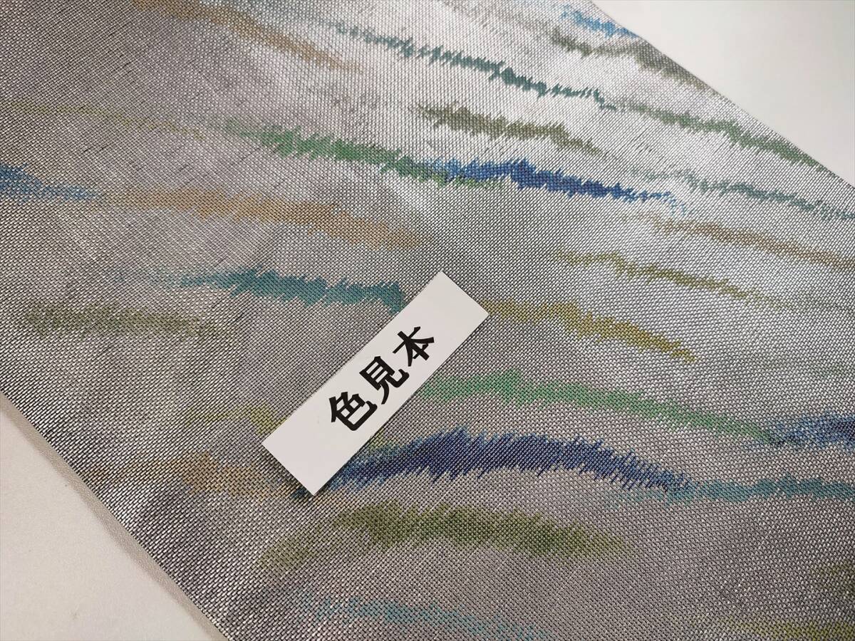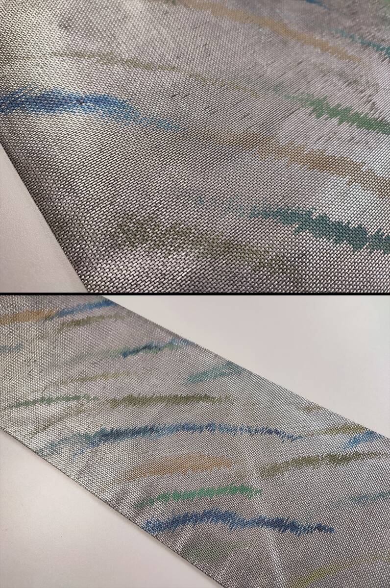 即決■着物の越田■幅30.5長さ351 正絹 名古屋帯 夏帯 名古屋仕立て シルバー 抽象柄 六通 ■ふ08J04a