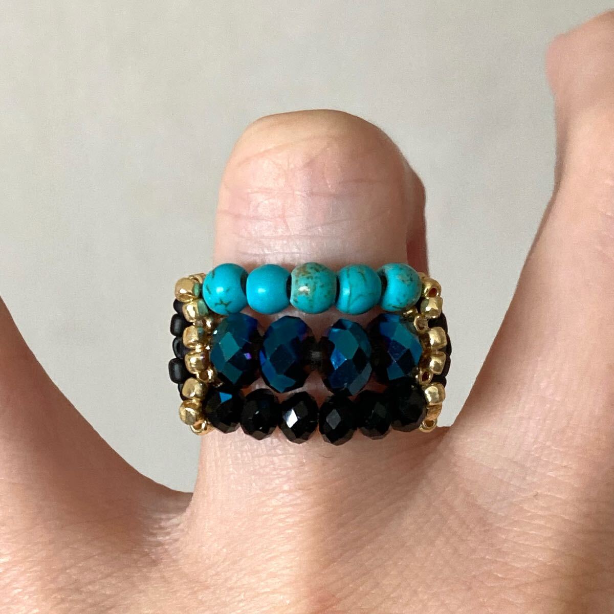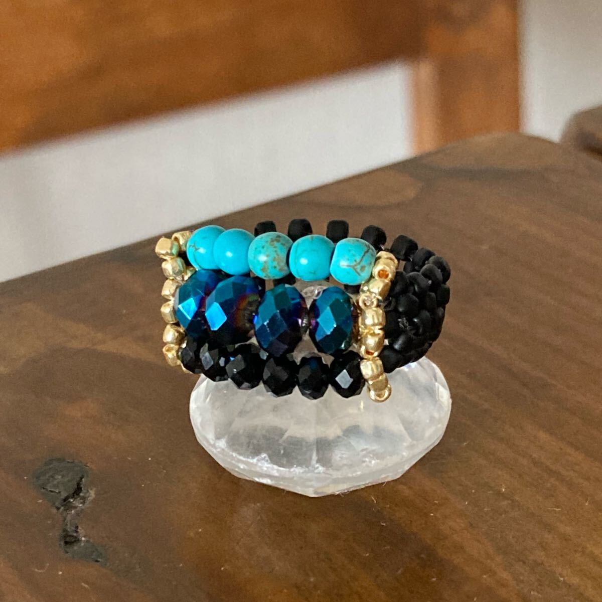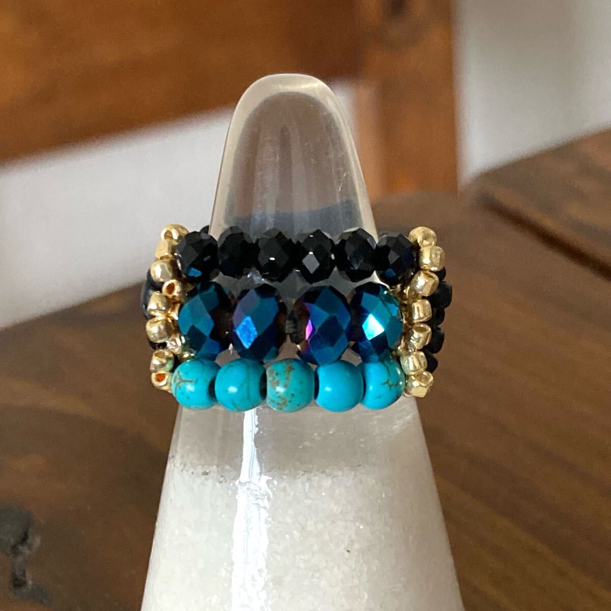 6mmのメタリックブルーのボタンカットビーズ、4mmの黒のボタンカットビーズ、練りターコイズのラウンドビーズ、ゴールドのスリーカットビーズ、マットな黒の丸大ビーズで作ったリングです。