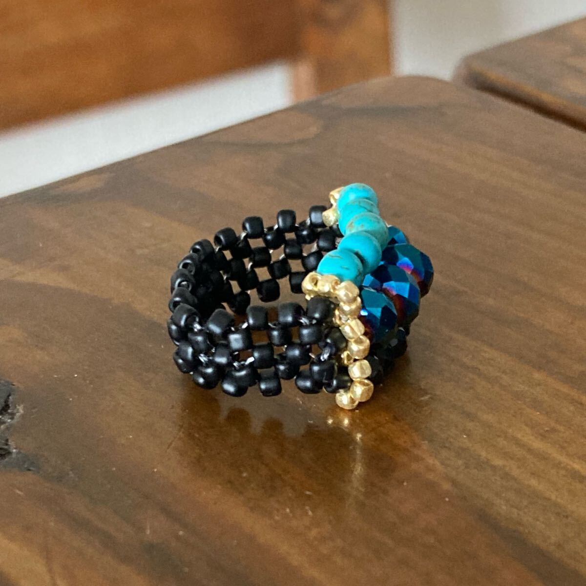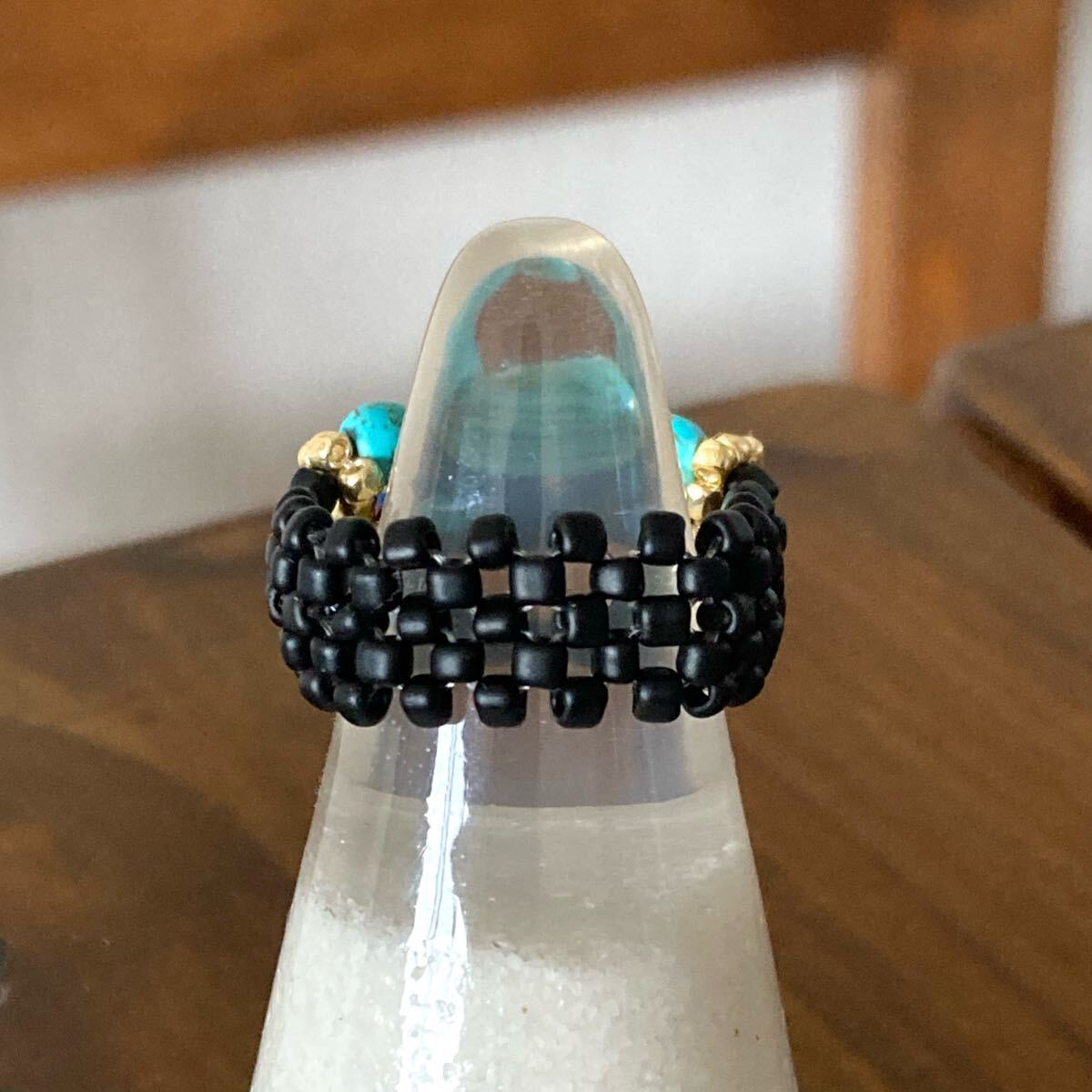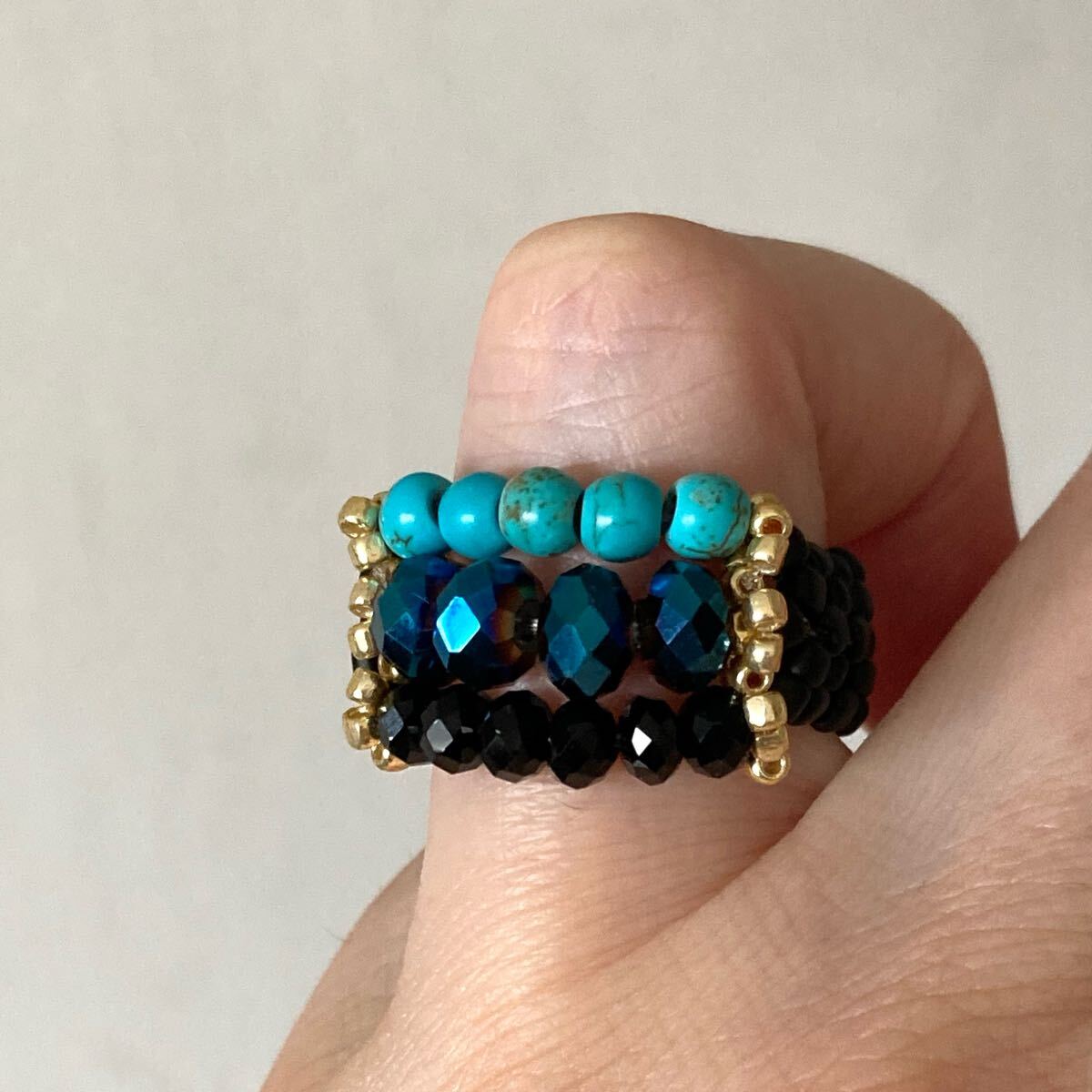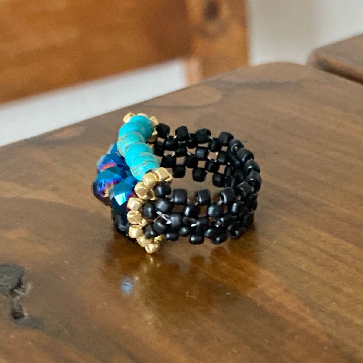 6mmのメタリックブルーのボタンカットビーズ、4mmの黒のボタンカットビーズ、練りターコイズのラウンドビーズ、ゴールドのスリーカットビーズ、マットな黒の丸大ビーズで作ったリングです。