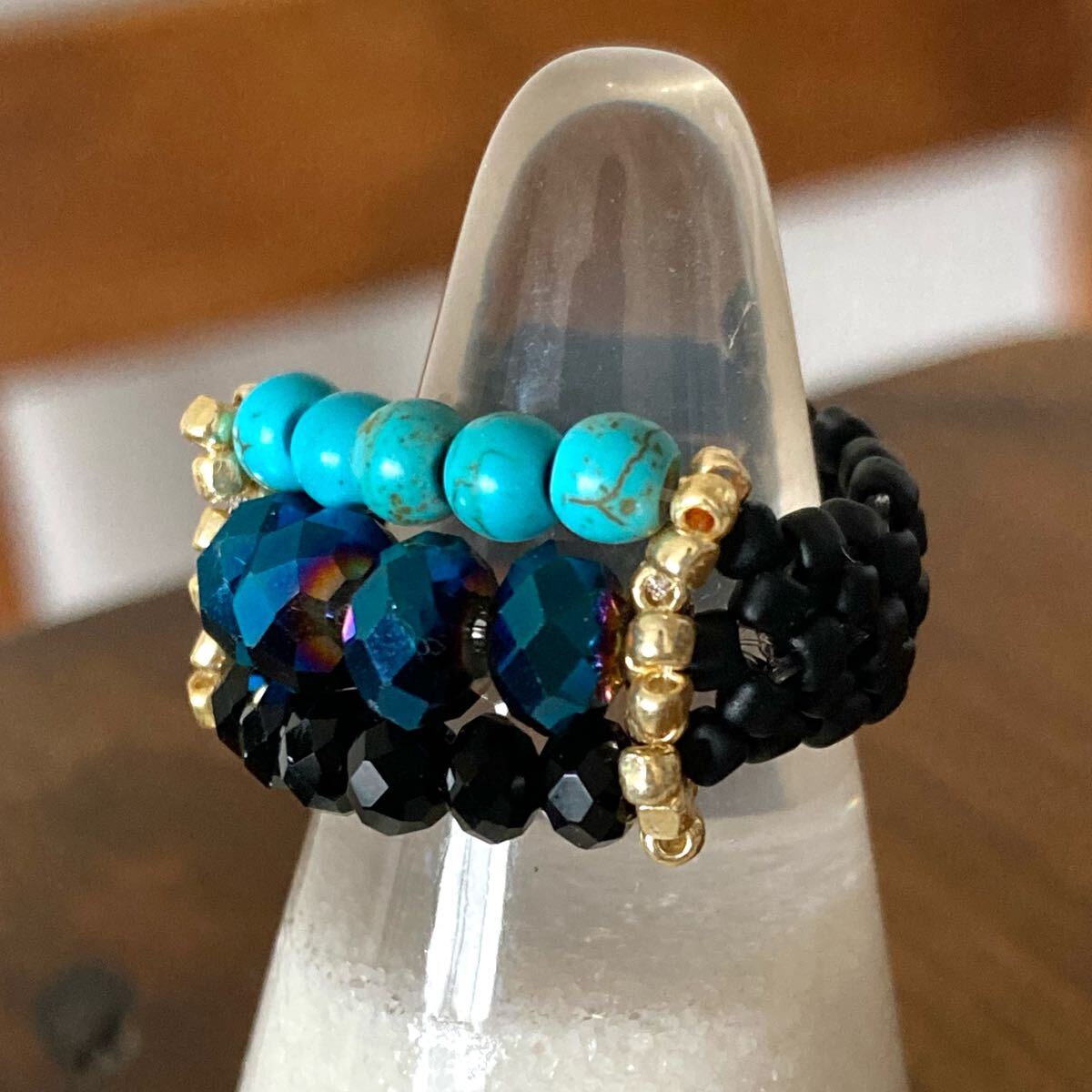 ビーズ リング  指輪 ハンドメイド ボタンカットビーズとラウンドビーズのお洒落3段リング ブルー×黒 14 -16号です。