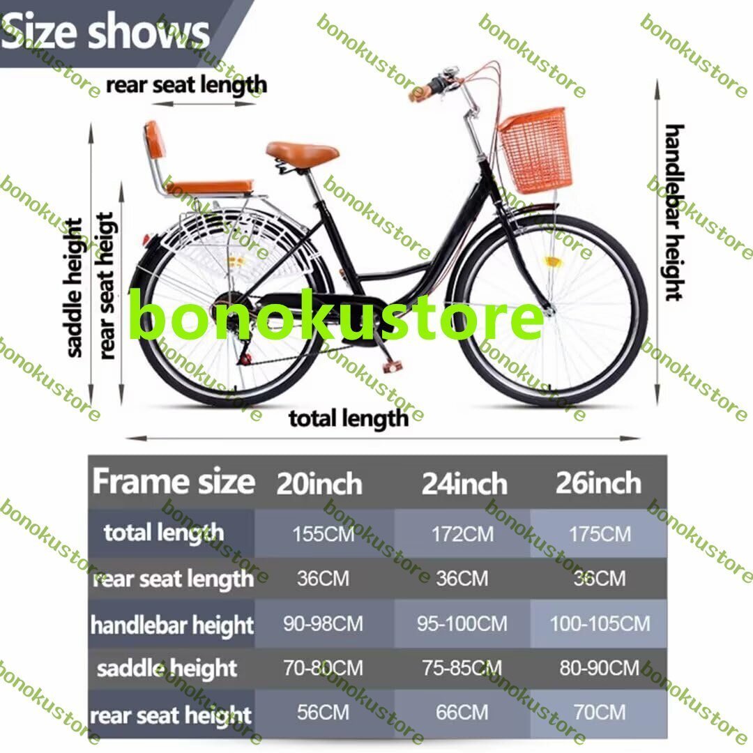 26インチ-全長179cm、サドル高さ80-90cm、ホイール直径63cm、ハンドルバー高さ100-105cm、スーツ身長160-180cm/5.2-5.9フィート。