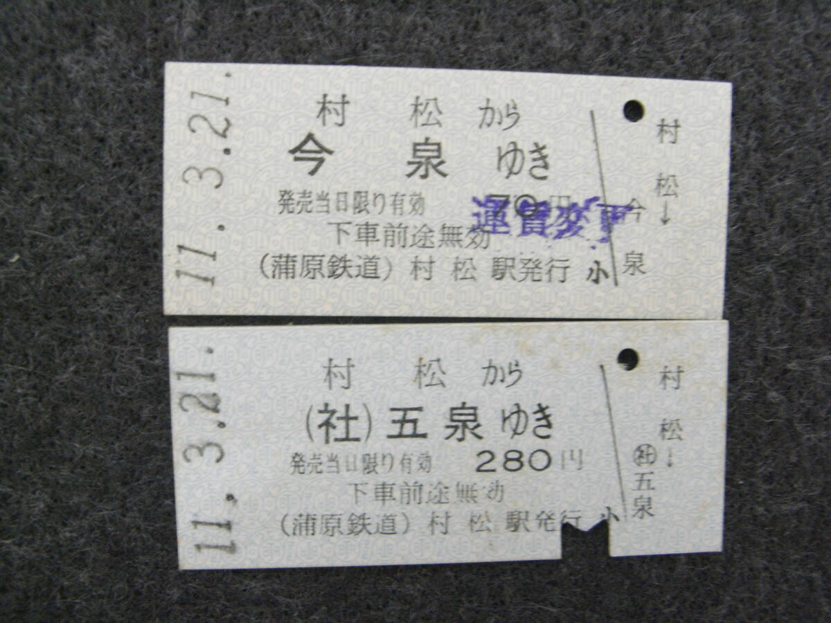 2枚/蒲原鉄道 村松から(社)五泉ゆき・村松から今泉ゆき 平成11年3月21日 村松駅発行 2枚 廃線 廃駅