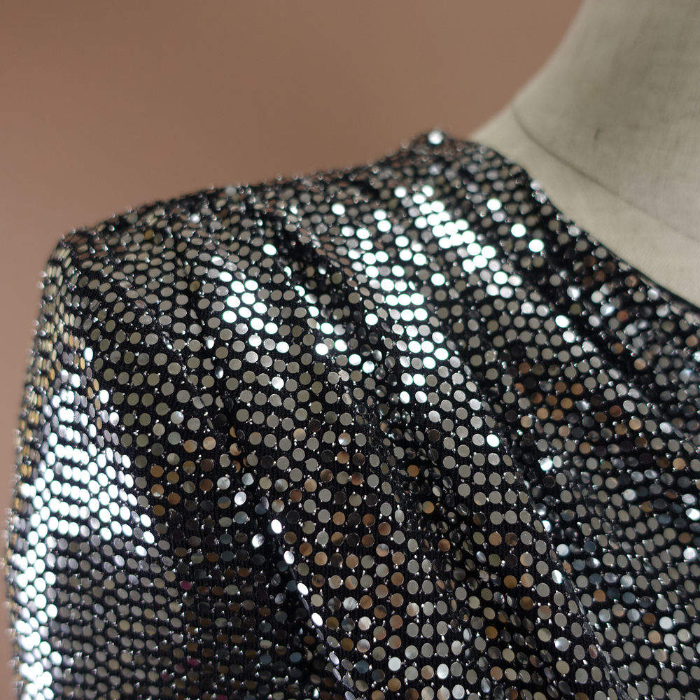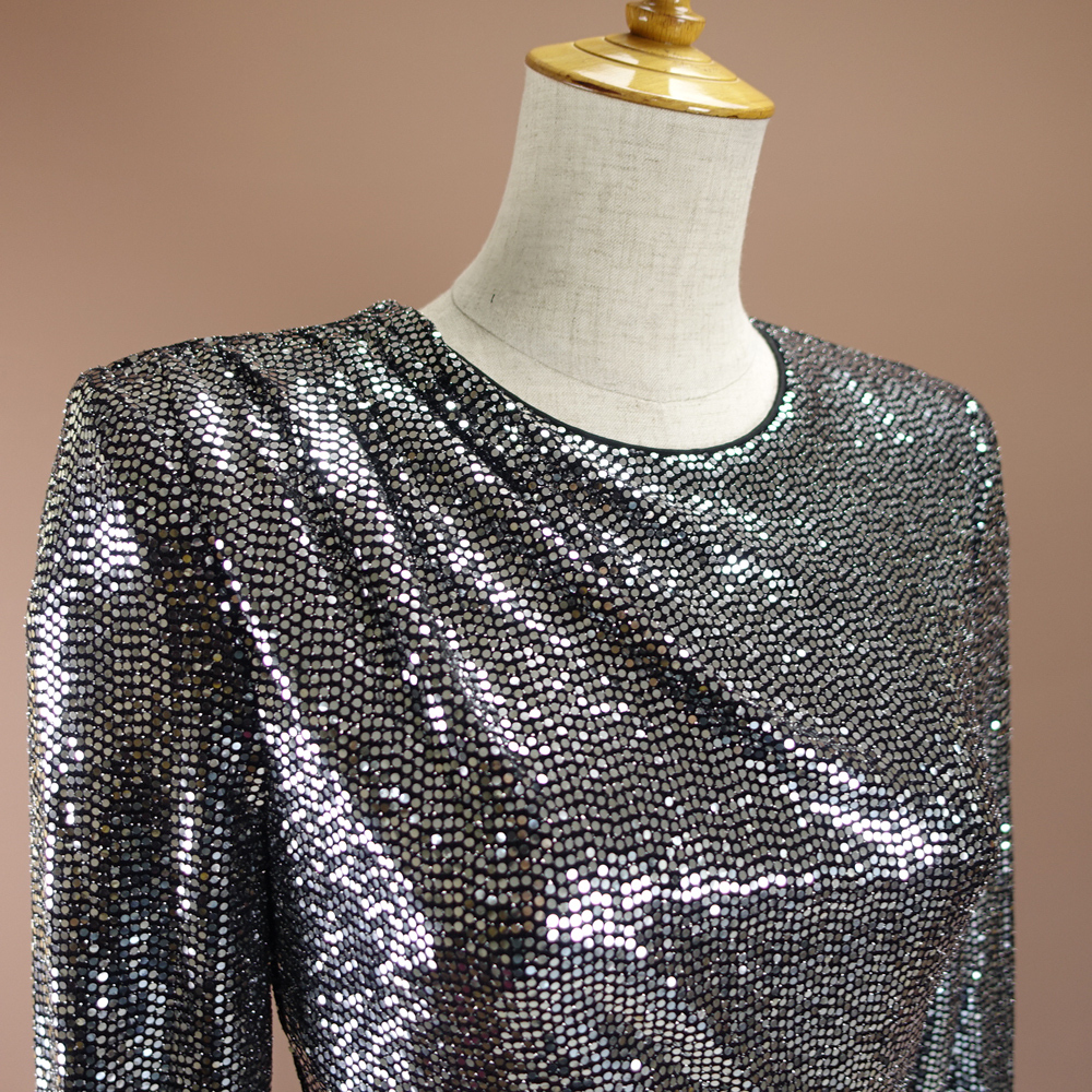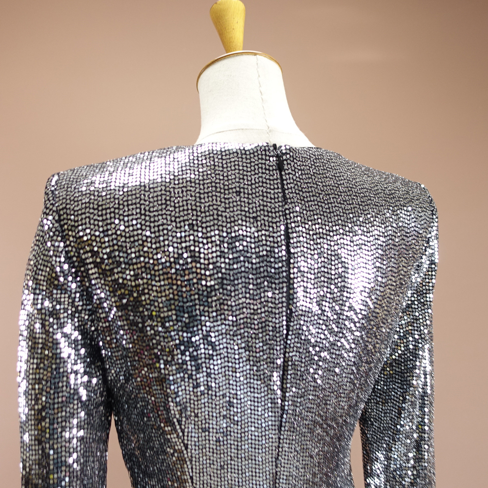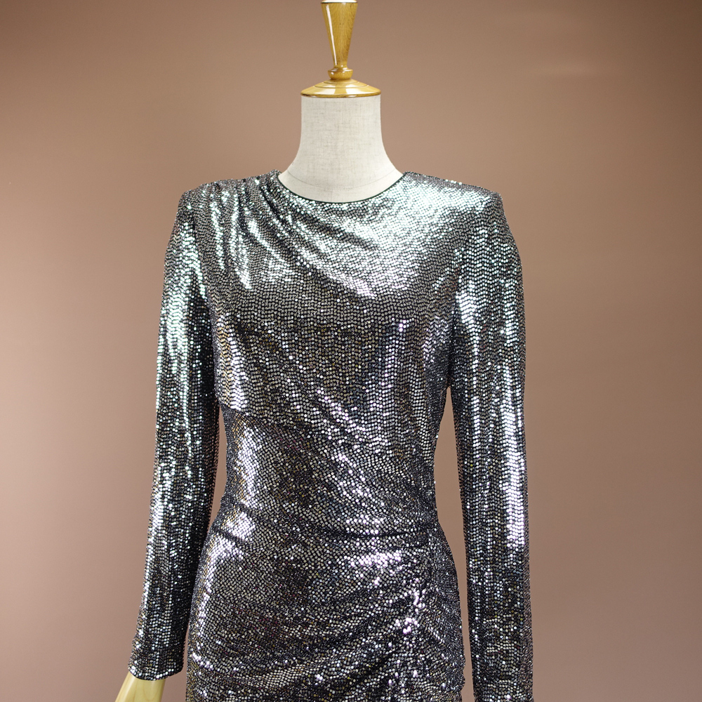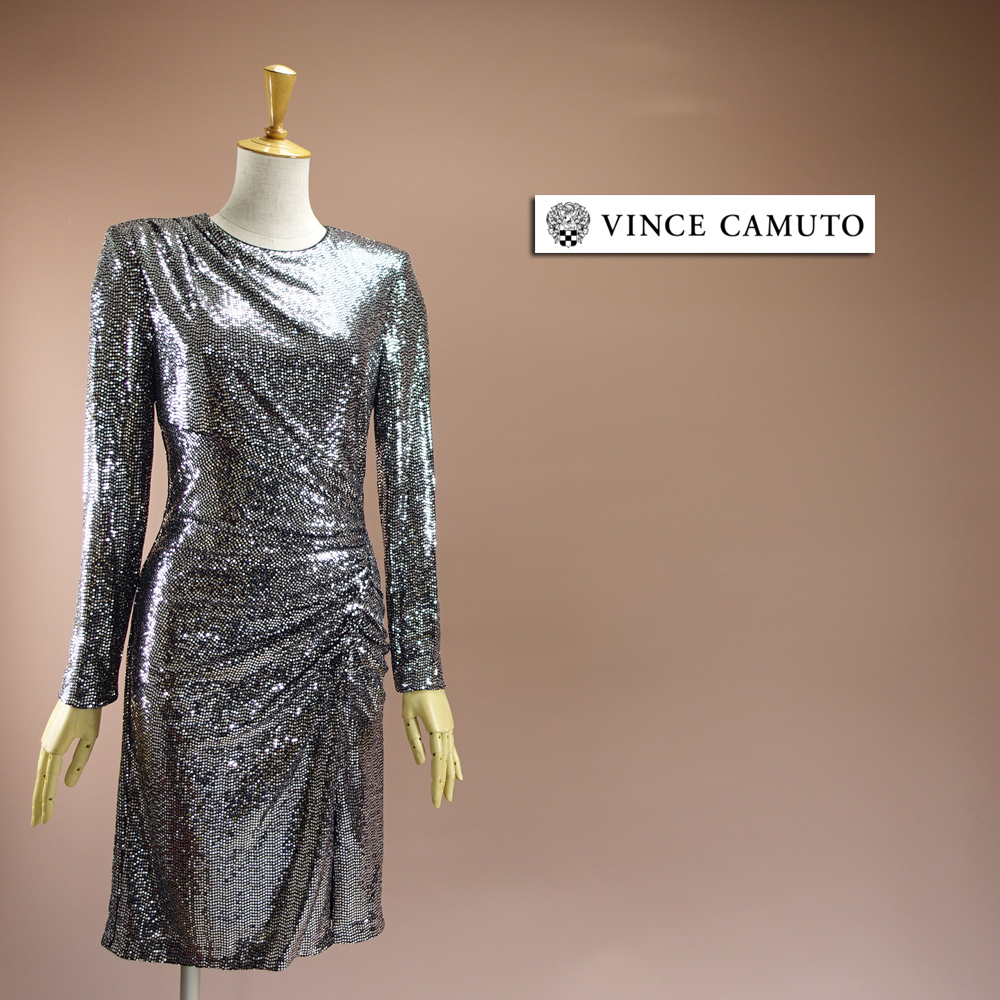 新品ヴィンスカムート 13号 シルバー スパンコールドレープ 長袖 タイト ワンピース パーティドレス 結婚式 舞台 輝29W1904