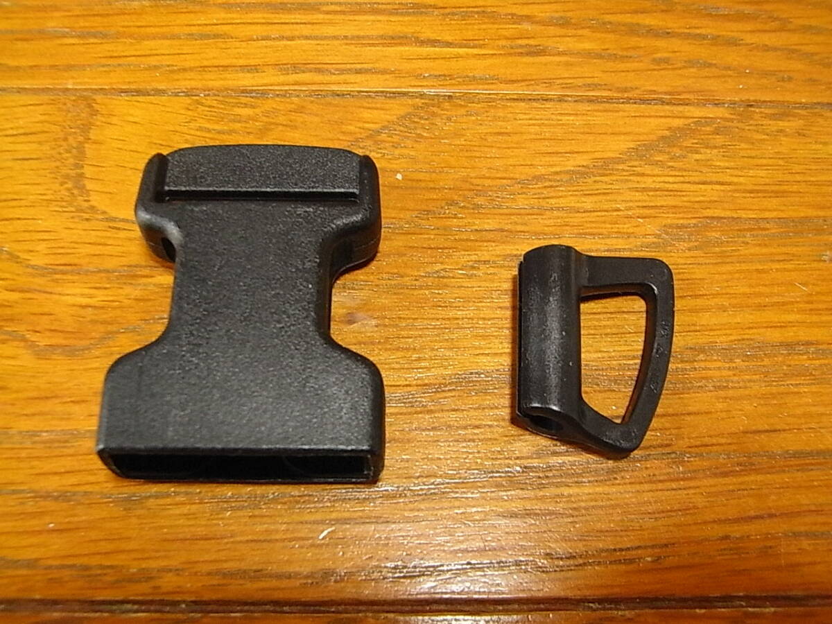 DURAFLEXの25mmバックルのメス(06年製)、D-FLEXのコードに通して使用するテープアジャスターの2点セットです。