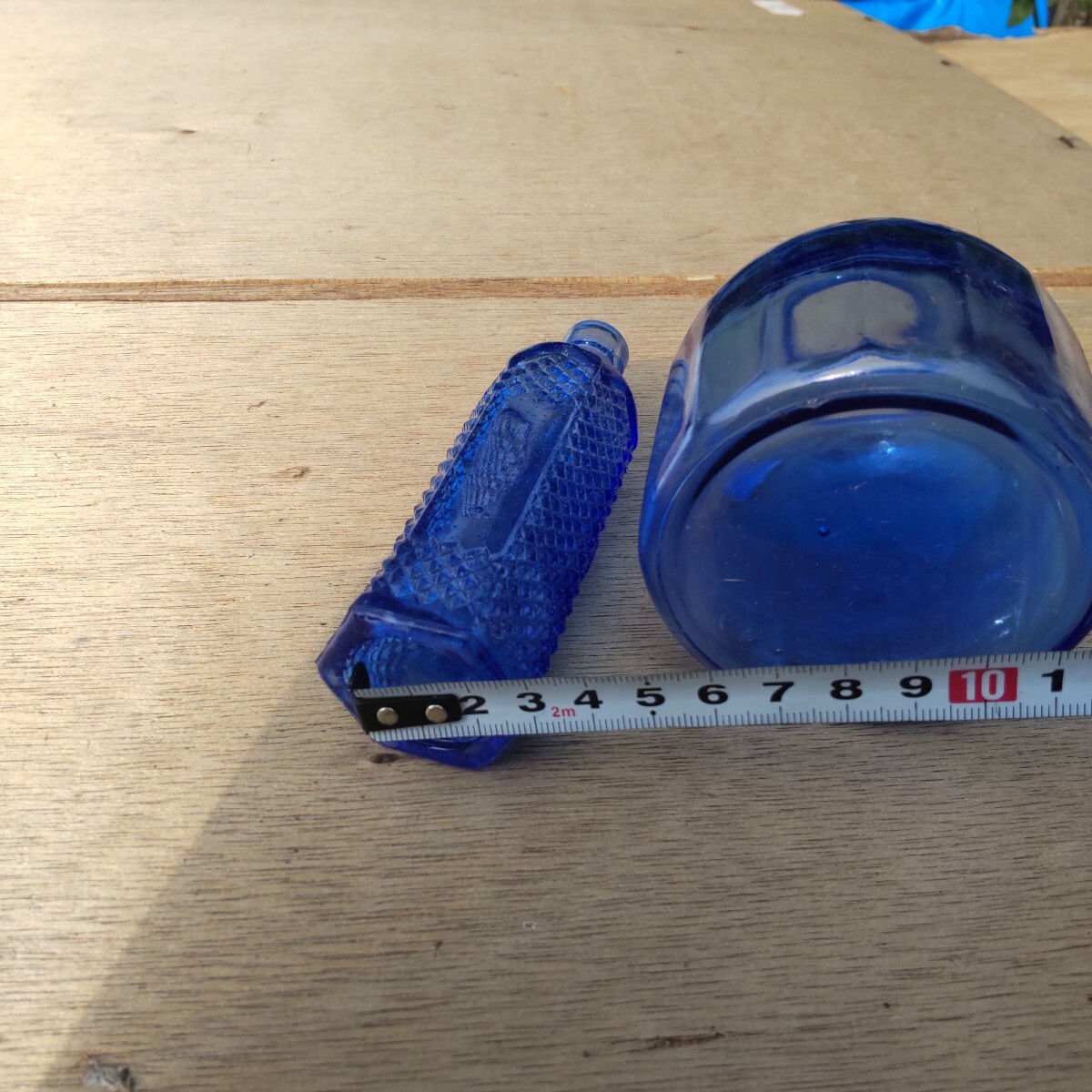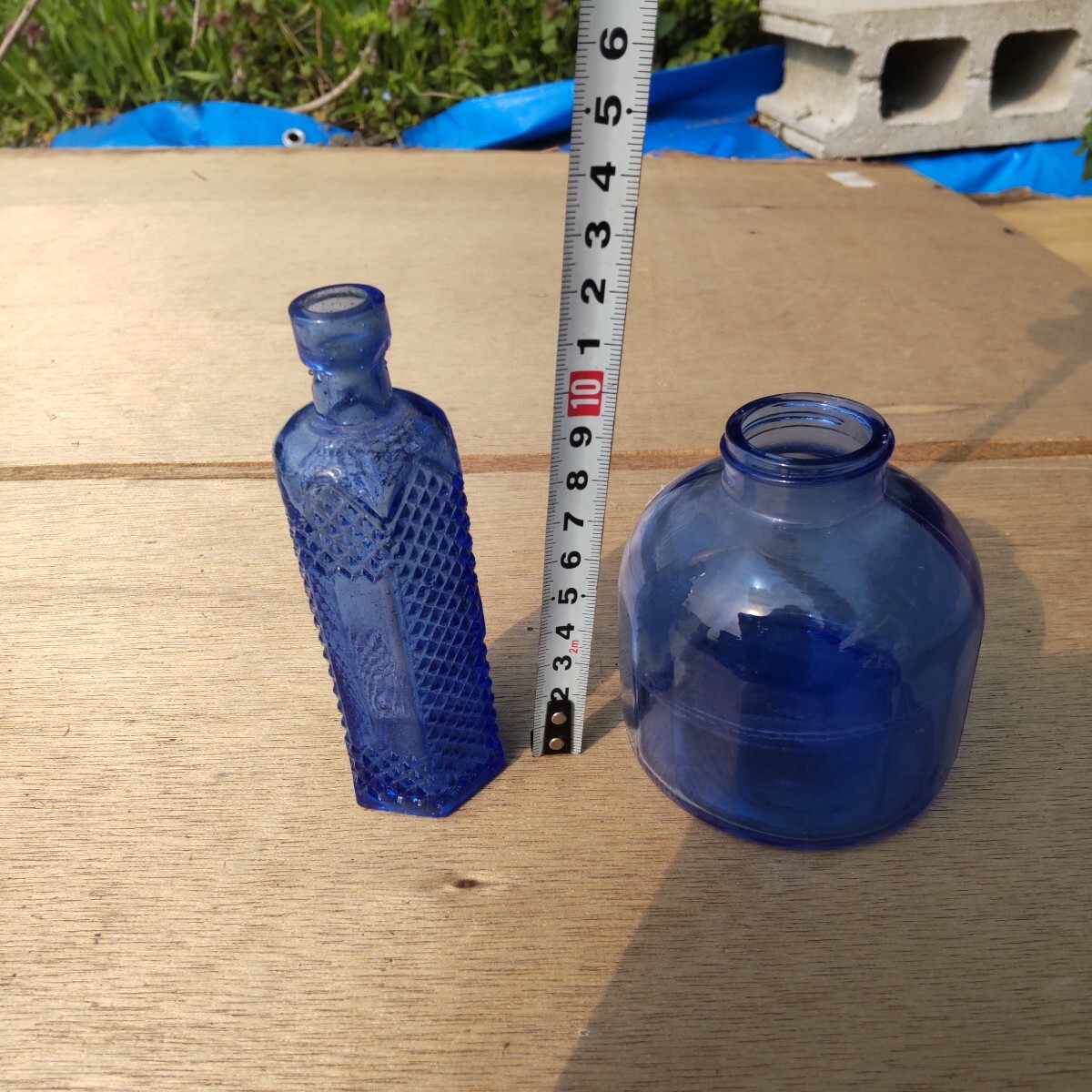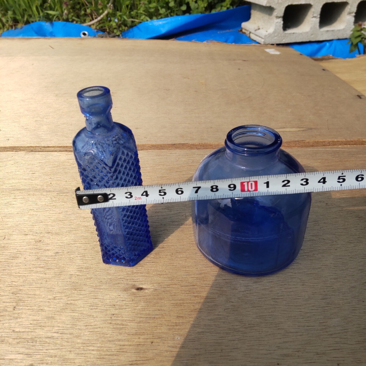 小さな方の神薬瓶の首の所にコズミ跡有りますので傷汚れ有りにしました。もう、1つのほうは、大丈夫です。コバルトブル―の瓶2セットです。当方知識が有りません。お好きな方インテリアに。両方気泡有ります。小さな方が気泡多めです(写真3)こちらが、粒々で。分かりにくいのですが、写真4にあるように大きな方は、下半分に均等に筋が入っているものになります。