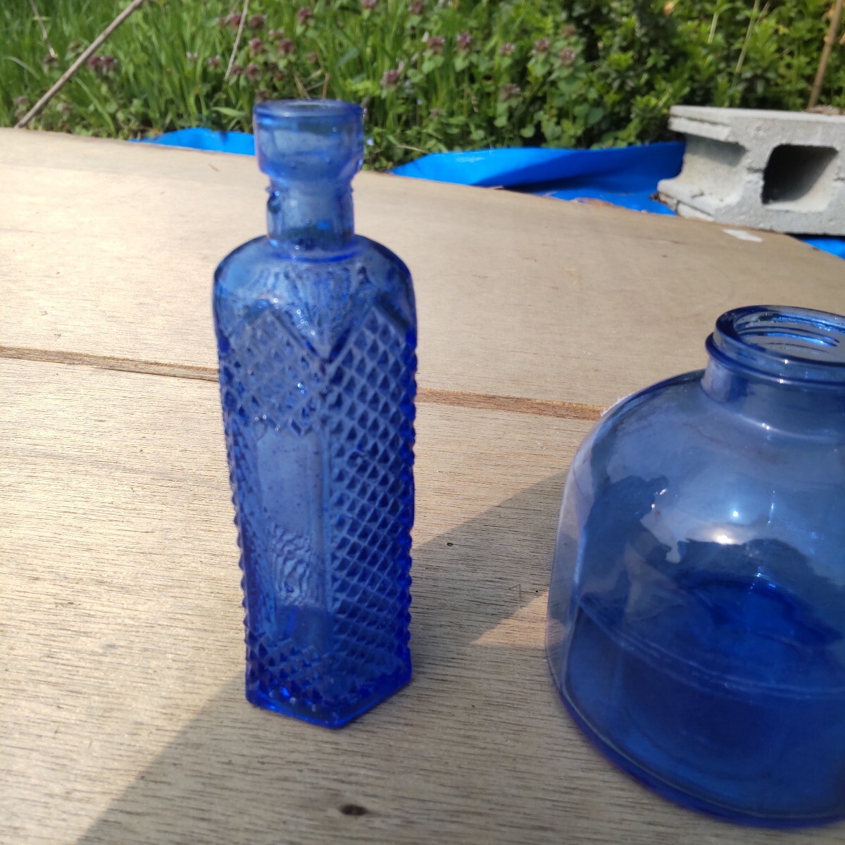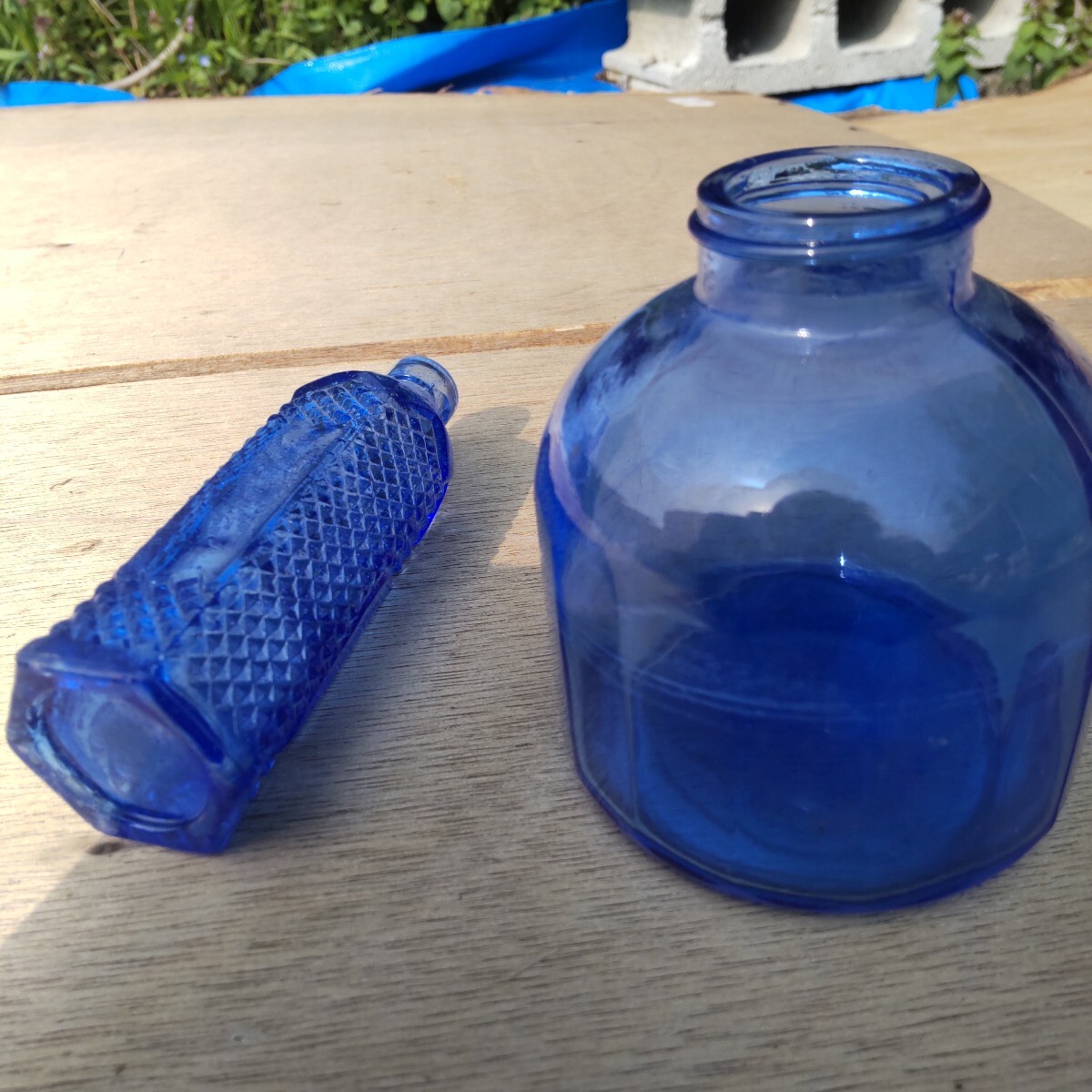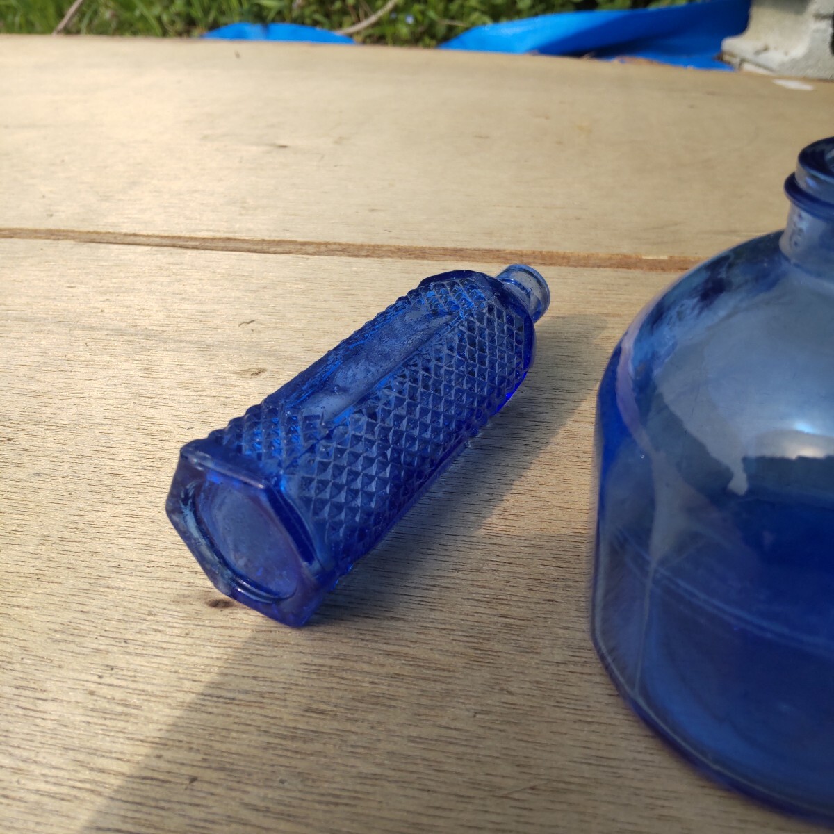 小さな方の神薬瓶の首の所にコズミ跡有りますので傷汚れ有りにしました。もう、1つのほうは、大丈夫です。コバルトブル―の瓶2セットです。当方知識が有りません。お好きな方インテリアに。両方気泡有ります。小さな方が気泡多めです(写真3)こちらが、粒々で。分かりにくいのですが、写真4にあるように大きな方は、下半分に均等に筋が入っているものになります。