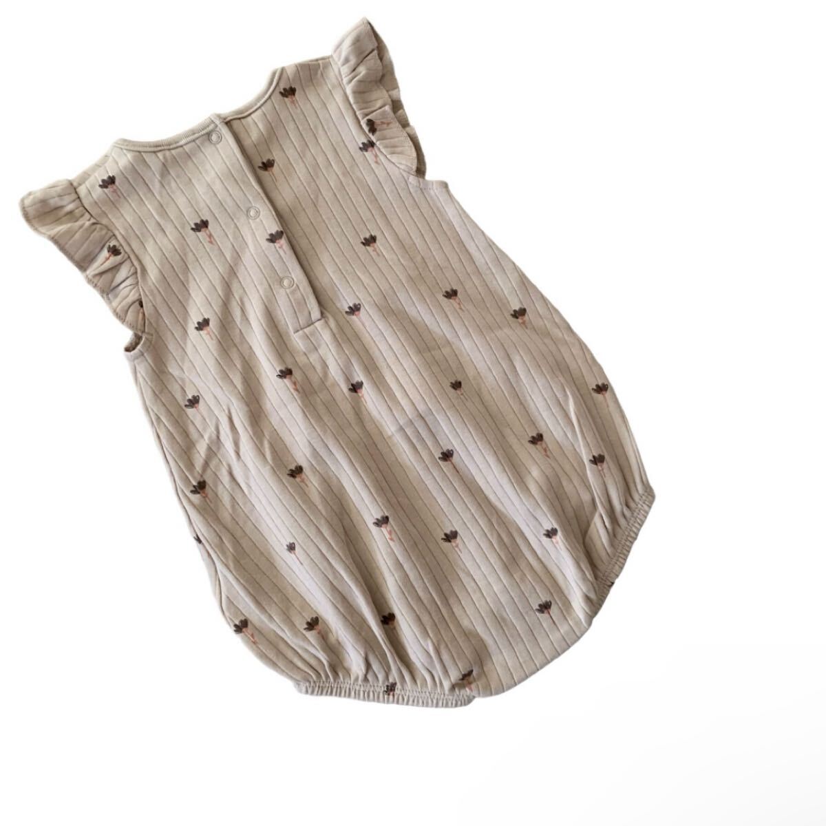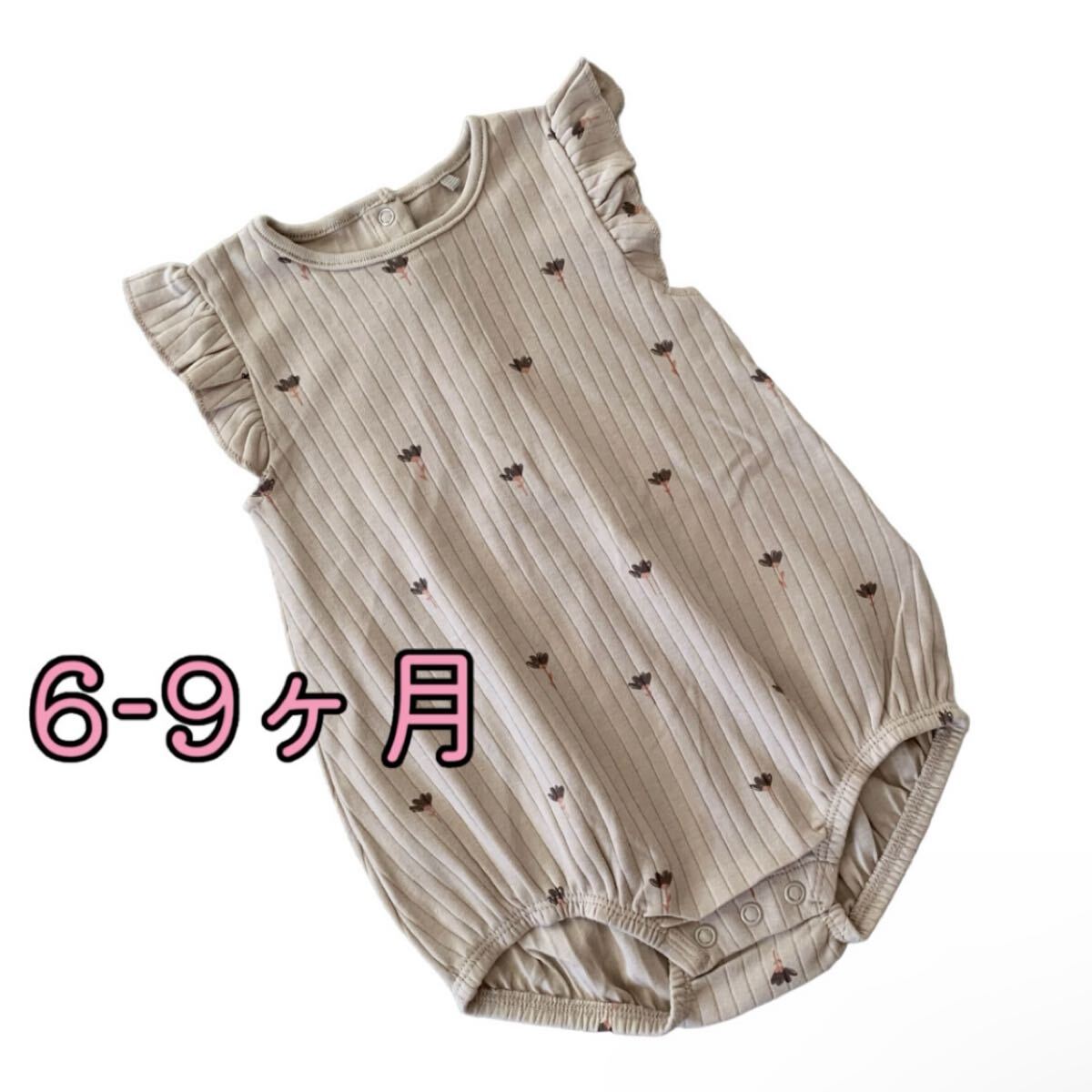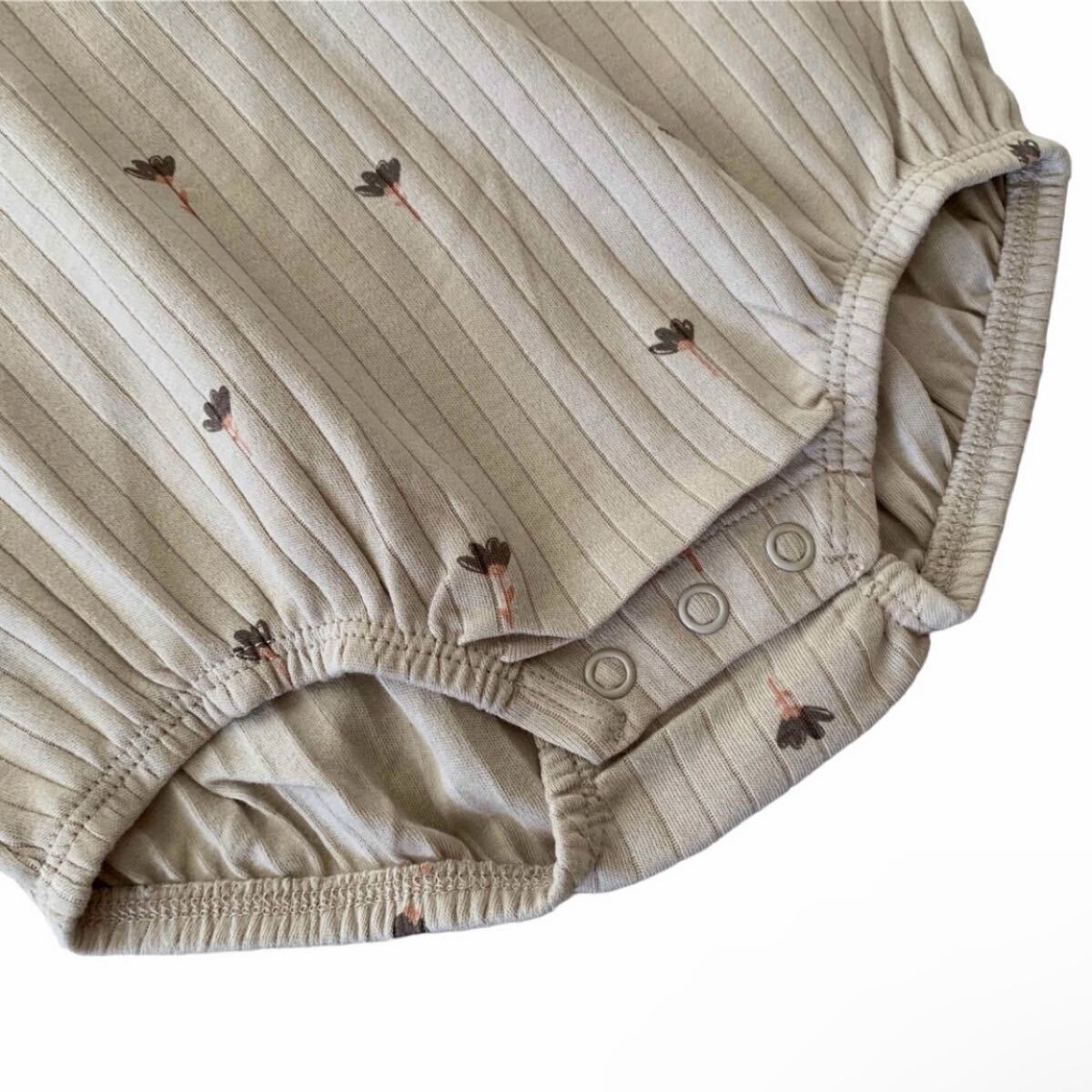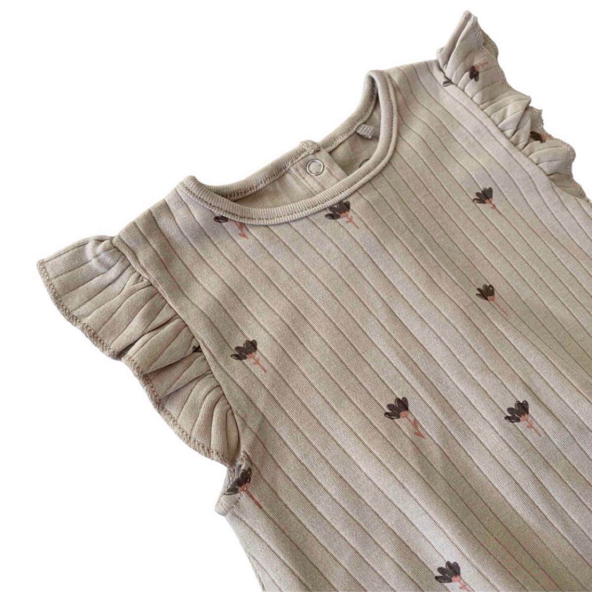 ブラウンベージュにダークブラウンのお花柄がかわいいフリル袖のボディ