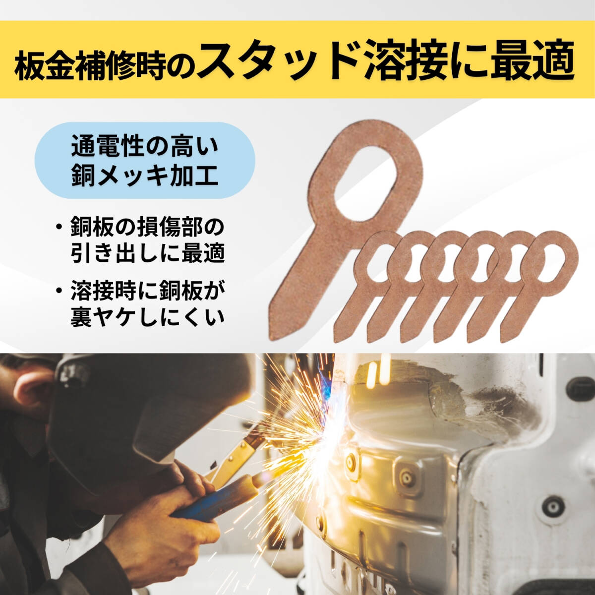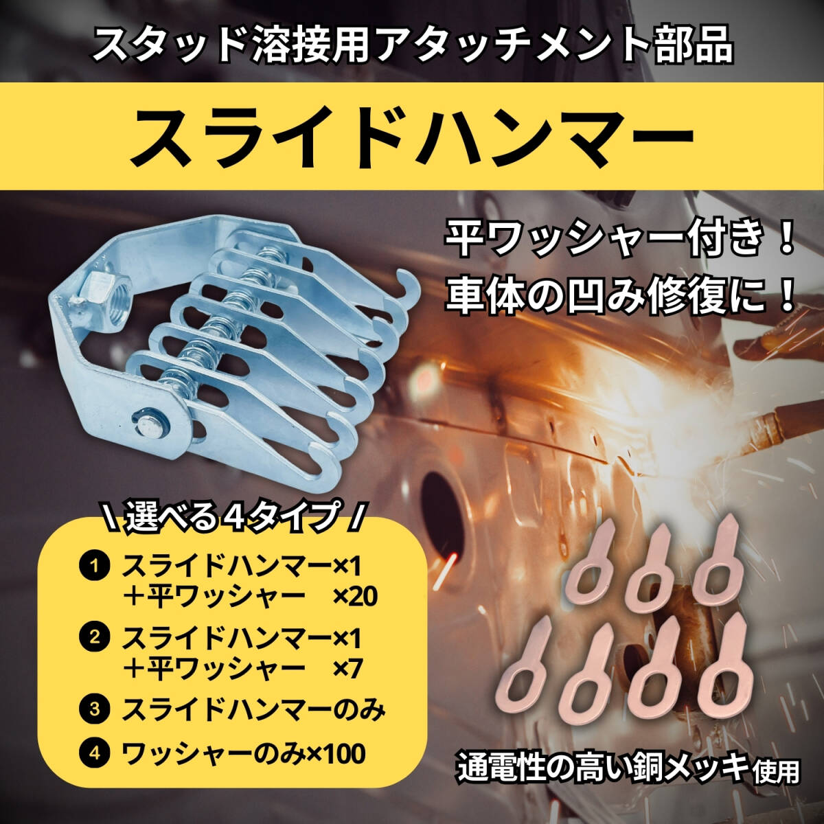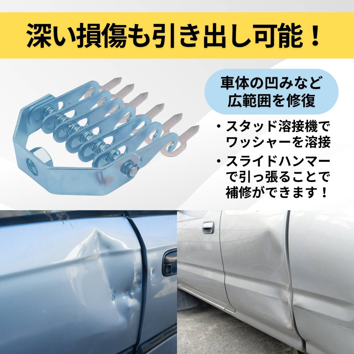 ・スタッド溶接機用の板金に使用されるアタッチメント工具です。 自動車の鋼板パネルの凹みや損傷部に溶接して取り付け、スライディングハンマー(スライドハンマー)などでワッシャーをフックにひっかけて一気に引き出し補修できます。