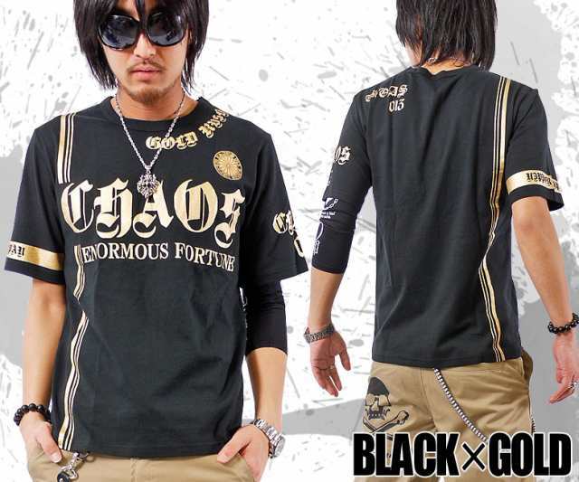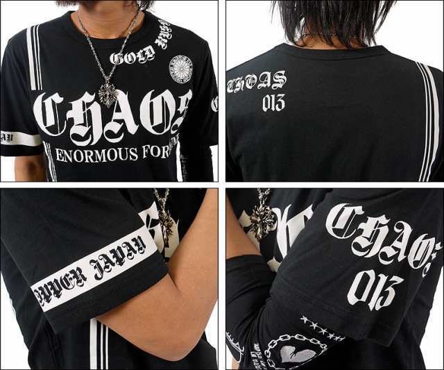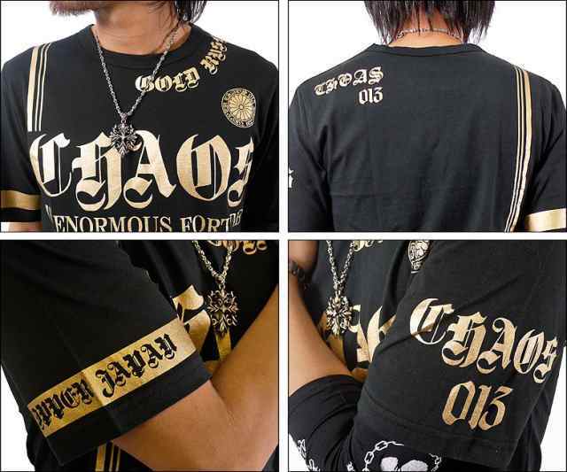 CHAOS JAPAN菊紋3本ラインロゴ腕サイドバック英字プリント 半袖Tシャツ ch-ry-2006新品 ブラックxゴールドL