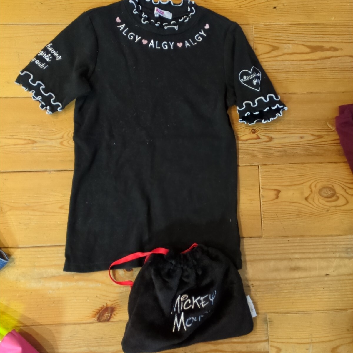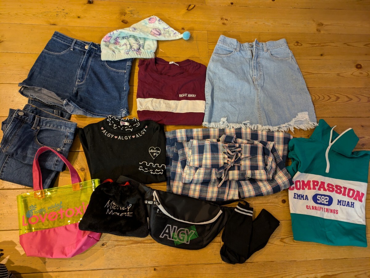 休日着で買ったので着用感少なめ、未使用あります。すべて150センチ時代に購入ひたお品です。ラブトキバック、ALGY斜めかけバック、ニーハイソックス、ALGY半袖カットソー、グリーンワンピース、新品。wegoスカート。チェックパンツ、H&Mショートパンツ、GUデニム、エンジカットソー。水泳速乾帽子タオル。ディズニー巾着。新品。自己紹介一読下さい