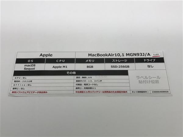 | MacBookAir 2020年 MGN93J/A【安心保証】 |