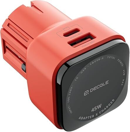 [一台多役、USBポート×2・USB-AとC各一] 本製品はUSBポートを2個、USB-AとCポート各1個を内蔵しており、最大2台までのデバイスを同時充電が可能です。GaN 45Wの最大出力はスマホやスマートワッチなどのデバイスに急速充電ができます。また、変換プラグに内蔵しているスマートチップは、複数のデバイスを同時に充電する際に、自動的に電力を分配し、夜間に充電する場合にもデバイスを保護しています。