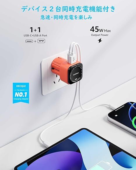 超ミニ 超コンパクト 海外 変換プラグ コンセントマルチ変換プラグ USB-C(GaN 45W)&1 USB-Aポート 全世界対応(アメリカ/イギリス/韓国/ヨーロッパ/オーストラリア/中国などの224+国々に対応) 0426