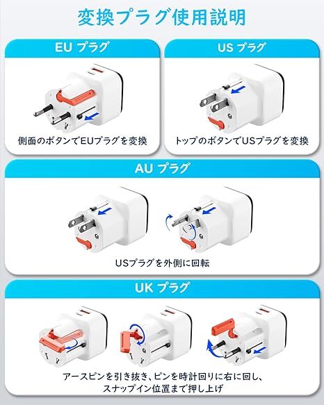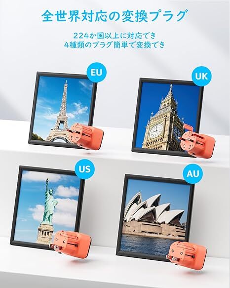[ご注意] 本製品の定格入力はAC100-240V、50-60Hzです。本製品に変圧機能はございませんので、ご使用の際は必ず電圧をご確認ください。インドや南アフリカなどのタイプは非対応のため、使用国のプラグタイプをご確認ください。また、本製品は海外での使用を目的としているため、日本国内でのご使用はできません。本製品にはAC電源ソケットが付いておらず、ACコンセントのプラグに差し込むことはできませんため、USBポートのみ使用可能です。
