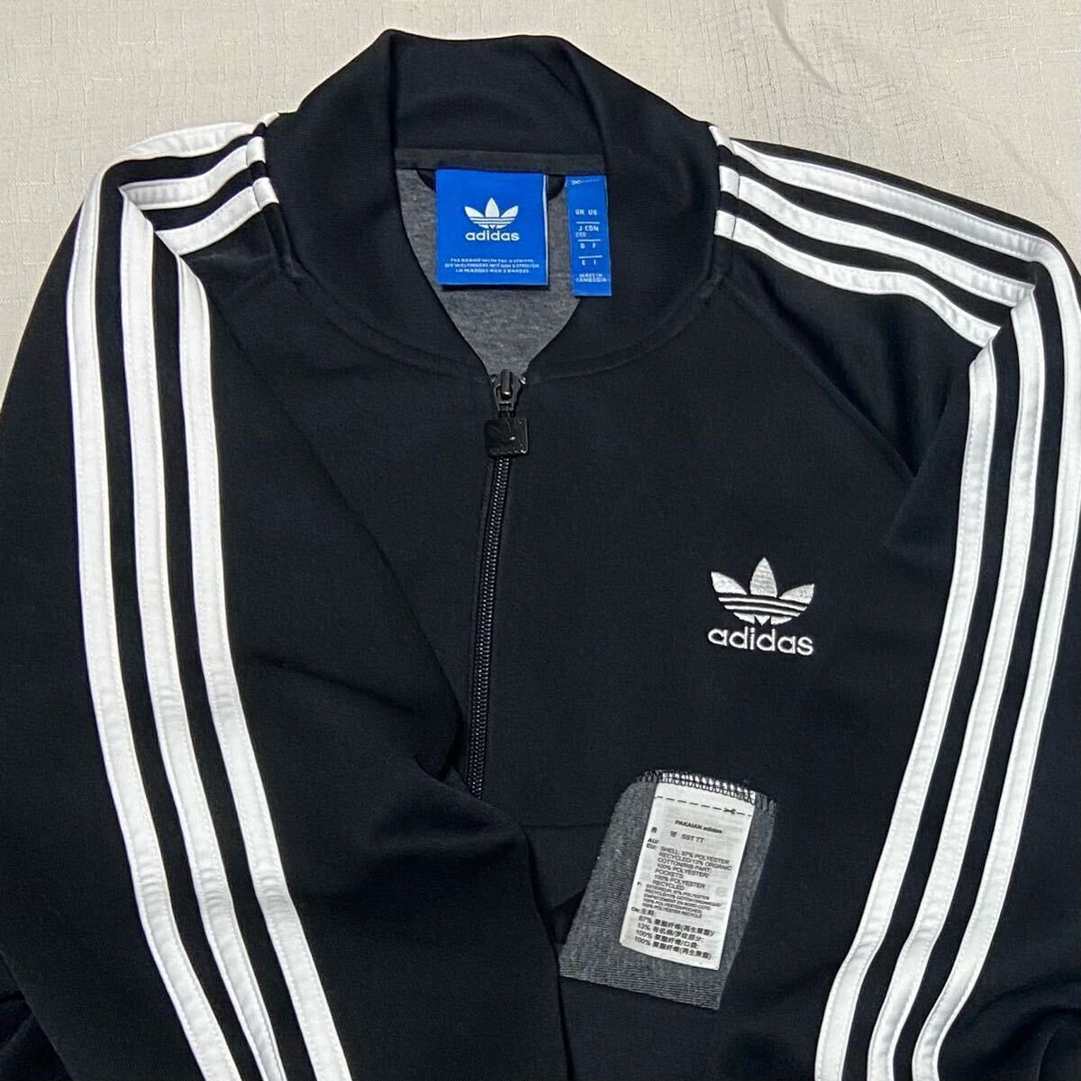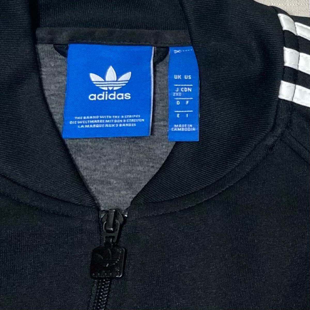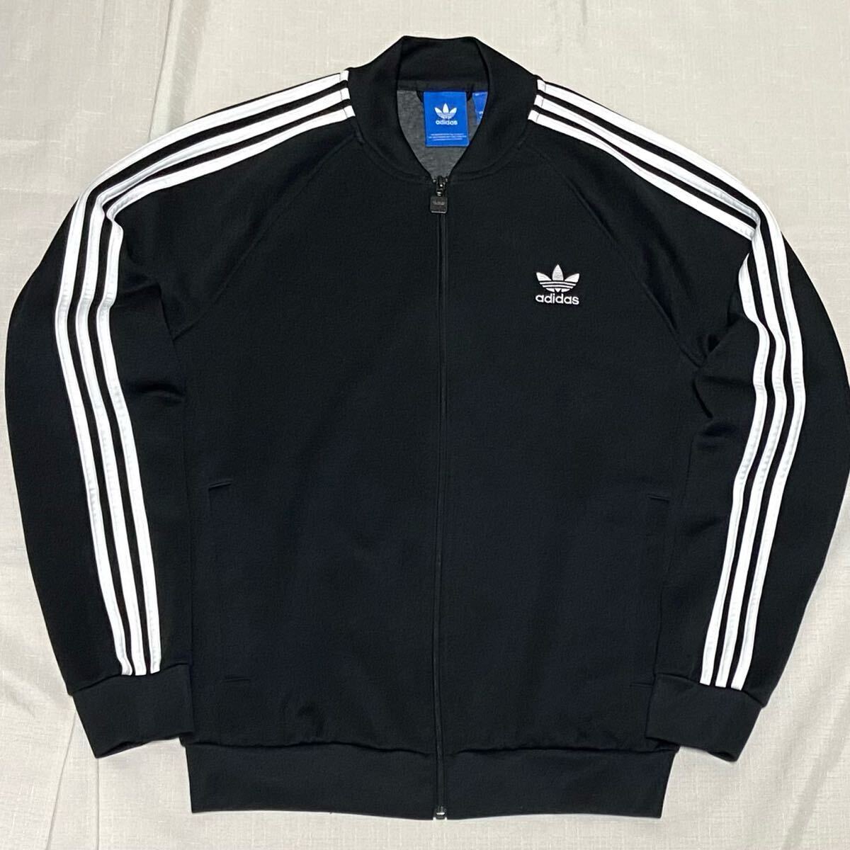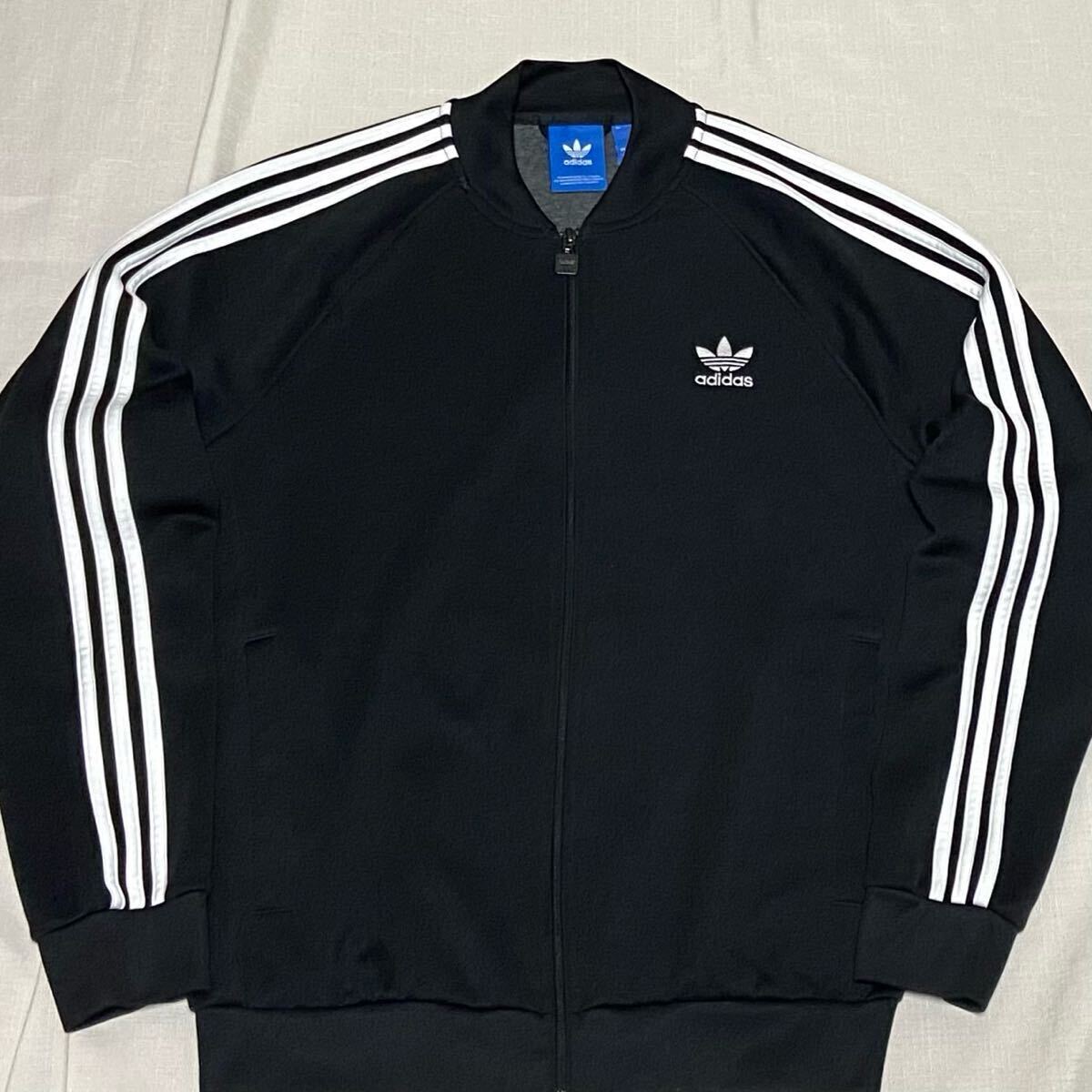 adidas アディダス オリジナルスのATPモデル(ビンテージ復刻)の黒×白のトレフォイルロゴのフルジップのジャージ(スーパースタートラックトップ、トラックジャケット)のサイズ2XOです。
