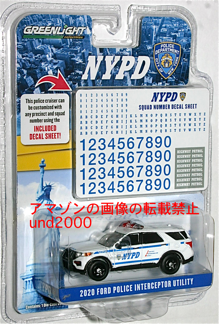Green Light、Hobby Exclusive、2020 Ford Police Interceptor Utility - New York City Police Department (NYPD)。ニューヨーク市警仕様。車体ナンバー・デカール・シート付き。スケール1/64。トミカ・サイズ。並行輸入品。未使用新品。ブリスターに若干のスレがあります。量産品の製品のクオリティーについてはノークレームでお願いいたします。お支払いはヤフーかんたん決済のみ。東京発、ゆうパック持込60サイズ(東京700円 - 沖縄1330円)、レターパックプラス600円、または定形外郵便(追跡番号、保険無し)450円の発送となります。(上記の送料はこの出品物のみの料金となります。複数落札、同梱包発送の場合、重さ、サイズが変わりますので送料が変わります。)3日以内のご連絡、かんたん決済の支払期限内(通常5日、支払方法により異なります)のお支払い厳守でお願いします。入札される前に「自己紹介」もあわせてお読みください。 検索用ワード グリーン・ライト パトカー パトロールカー ポリスカー 警察 警視庁 Police Car ユーティリティー ニューヨーク市警