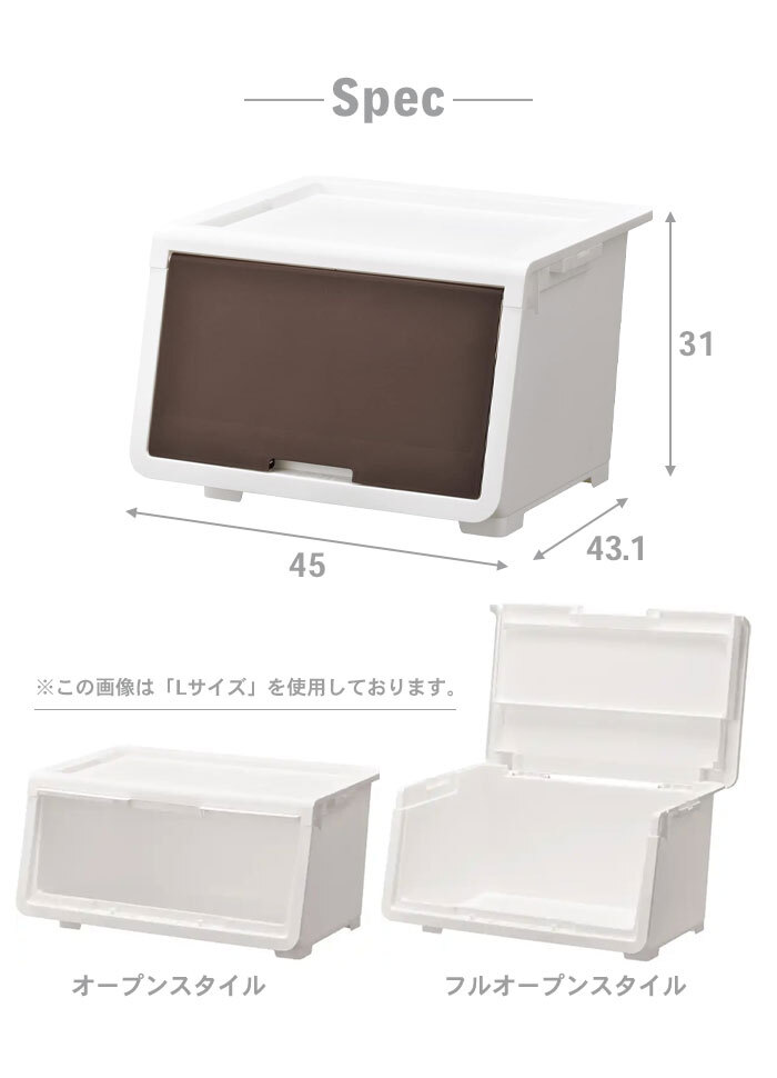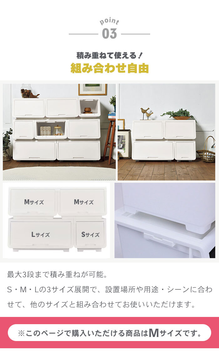 ロック付きのフラップ式収納ボックス。 サッと開いてすぐ取り出せる前開きスタイル、大きなものや奥にしまったものの出し入れがしやすいフルオープンスタイルの2パターンのオープンスタイル。 フタを本体に収納できるので、口を開けたまま出し入れができて便利。 内側へスライドさせると蓋が開かないようロックされるロック機能付き。 小さなお子様がいるご家庭ではチャイルドロックとして、また、持ち運びする際の中身の飛び出し防止にもなります。 フタの上部の溝と本体の脚が合うように設計されているので、ズレずにしっかり積み重ねができ、リビングや子供部屋、キッチン、ランドリー周りなど場所を選ばずお使いいただけます。 (※最大3段まで積み重ね可能) S・M・Lの3サイズ展開で、他のサイズとも積み重ねてお使いいただけます。 ※このページで購入いただける商品はMサイズです。 安心安全の日本製。 |