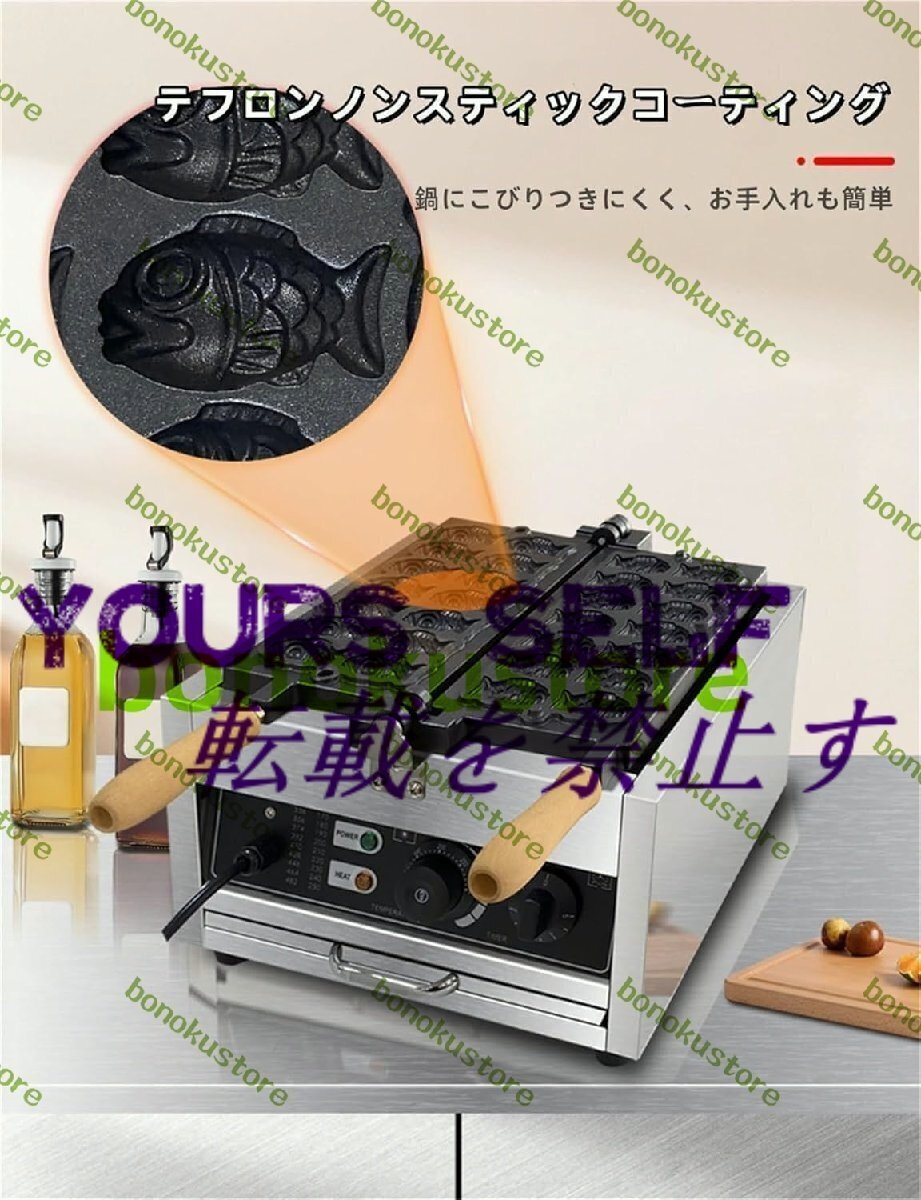 商品説明 商品の説明 商品の説明 小魚風: 【商品名】 6尾たい焼き機 【加熱方法】電気加熱 【商品サイズ】385×275×225mm 【温度範囲】50~300℃ 【梱包サイズ】510×460×260mm 【ケーキ型サイズ】90×70mm 【定格電力】1550W たい焼き機: 【商品名】電動6穴たい焼き機 【