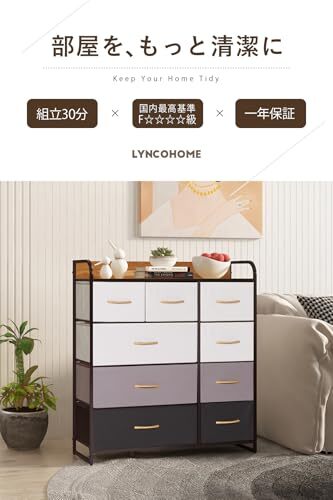 「LYNCOHOME 収納 チェスト タンス 布製 引き出し 多機能 大容量 衣類収納 マルチ収納 転倒防止 低ホルム 4段9杯幅87.5×奥行2」▼661706476348▼(商品説明)多機能E.キャメル/4段9杯/-・Color:E.キャメル・インテリアに馴染むデザイン柔らかなキャメルカラーに、素材感の高い木目調天板。洋室はもちろん、伝統的な和室にも合わせやすいシンプルなデザイン。おしゃれで清潔感あふれるお部屋作りを・驚くほどの収納力小物から大物まで仕分け収納できる引き出し9杯。アクセサリー・CD・雑貨・本・おもちゃ・化粧品・文房具・シャツ・スカート・靴下・下着・スカーフ・ネクタイなど小さめの衣類や小物を分けて収納できる6杯と、厚みのある衣類やバスタオルもたっぷり入れる大きい引き出し3杯。チェスト1台であらゆるものを収納・シックハウス対策万全全使用材料国内最高基準の「F」をクリアリビング、寝室、脱衣所、洗面所、玄関、廊下など、用途に合わせて様々な場所で活躍できる。子供部屋にも安心して使える身体に優しい家具を選び、安全で健康な生活を送ろう・転倒防止もばっちりシリーズ全品に壁用固定具と専用アジャスターが付属。チェストを常に水平に保つことができ、より安全性が高まる。さらに床に優しいフェルトも付属しており、フローリングの