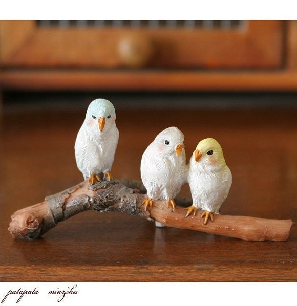 今にも動き出しそうなリアルなセキセイインコたちのオブジェです。