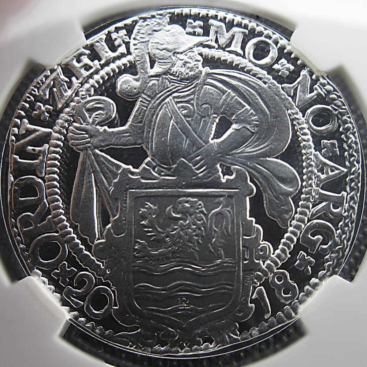裏面には、装甲騎士と、盾に刻まれた紋章が精緻に彫刻され、細やかな装飾が施されています。現代のモダンコインと比べて、当時の鋳造技術を忠実に再現した柔らかな輪郭が特徴で、時代背景を感じることができるリアリティが魅力的です。このコインを手に取ると、オランダの歴史を実感でき、胸が高鳴ることでしょう。