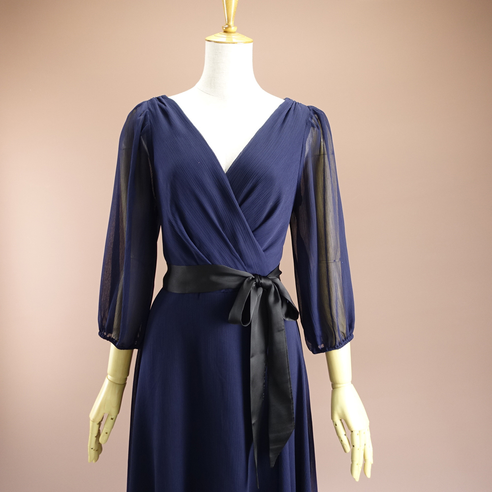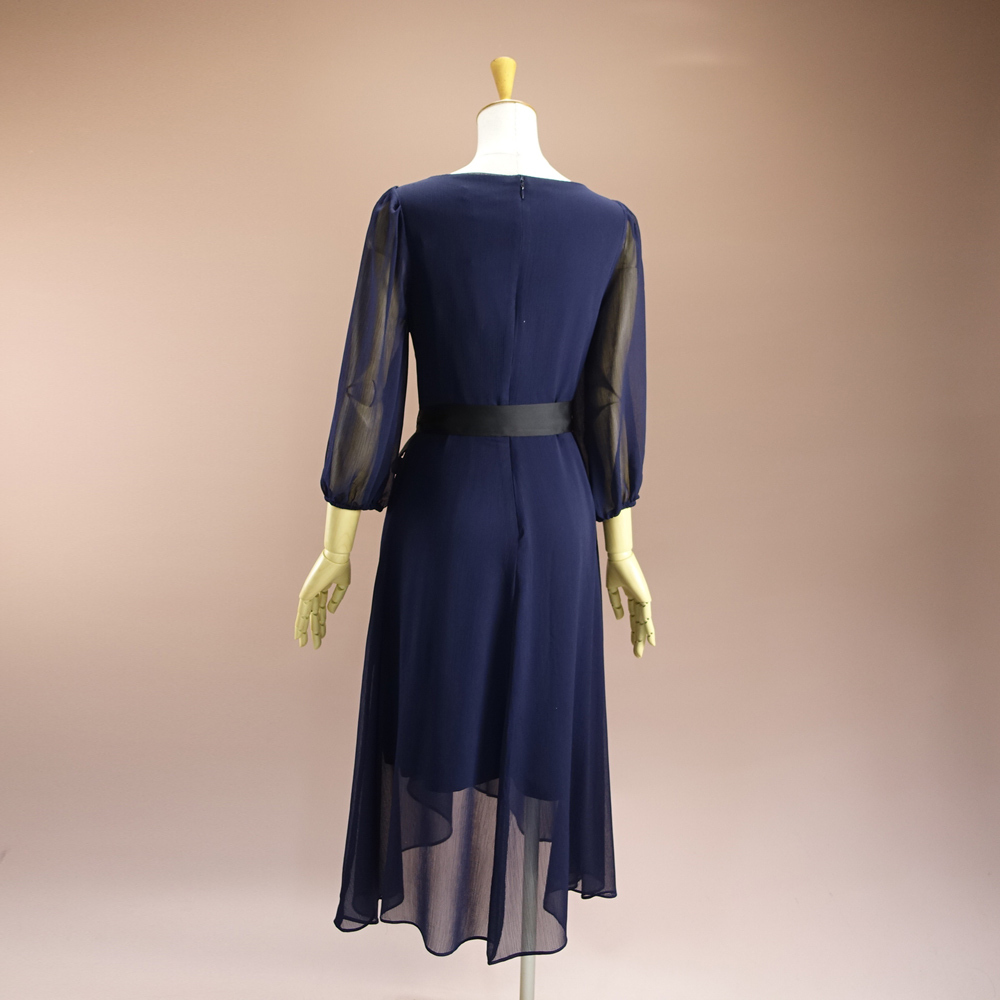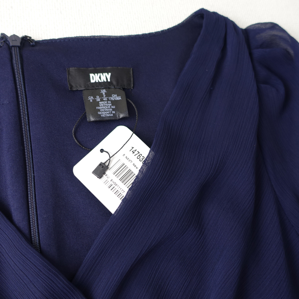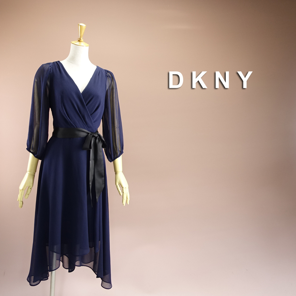 新品DKNY 13号 ダナキャランニューヨーク 紺 カシュクール風 パフスリーブ 7分袖 フレア ワンピース パーティドレス 女子会 輝31C0602
