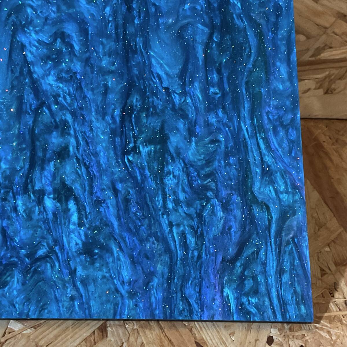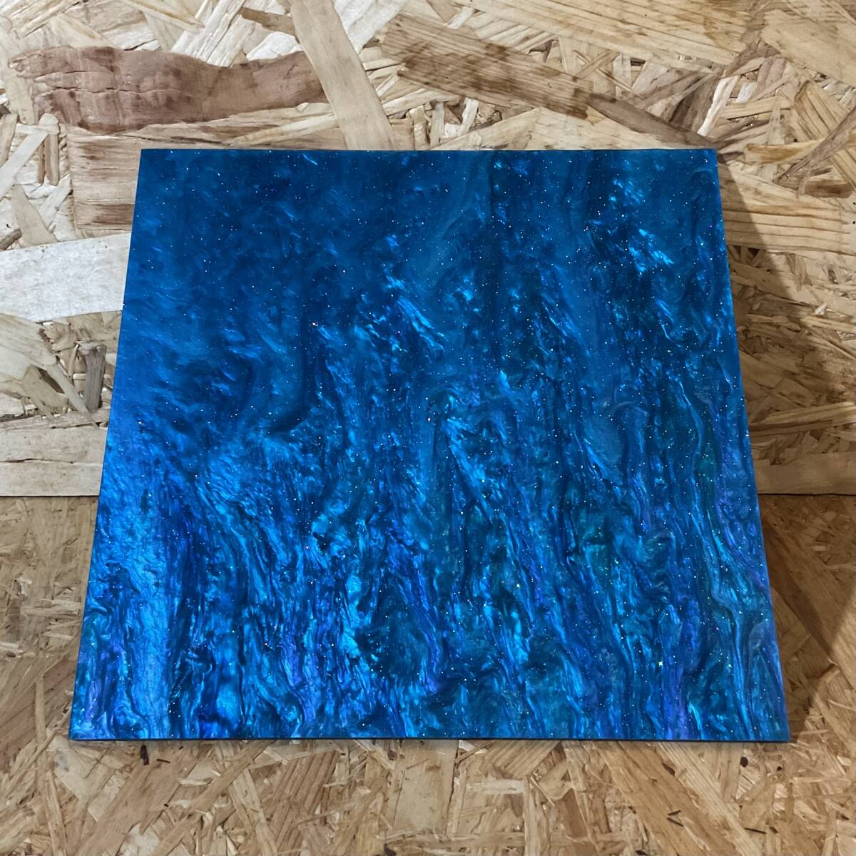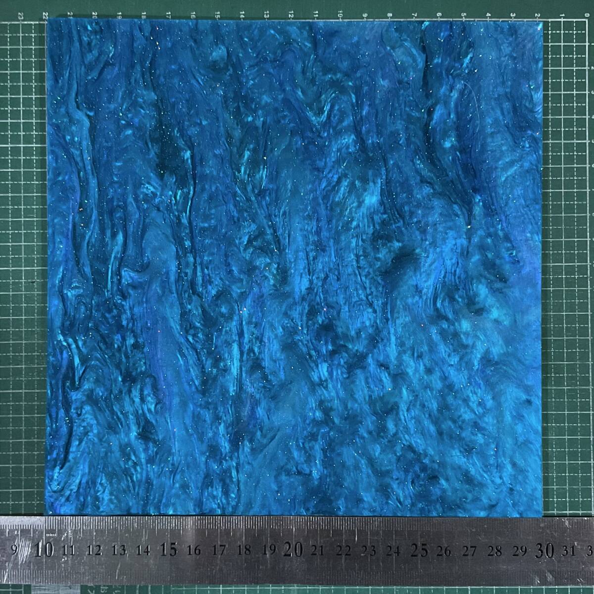 柄物のアクリルパール板です。表裏の柄は製造過程により模様の出方が違います。とっても鮮やかなエメラルドブルーの流雲柄です。もう方側はパールの面積多く雰囲気の違った模様になります。角度によりアワビや真珠貝の様に色の変化が見られ、プレート表面はフラットですが立体感の感じられる柄になっています。画像では青が強く出てグリーンのマーブルが目立っていませんが、実際はもう少しグリーンよりの深みのある深海色です。