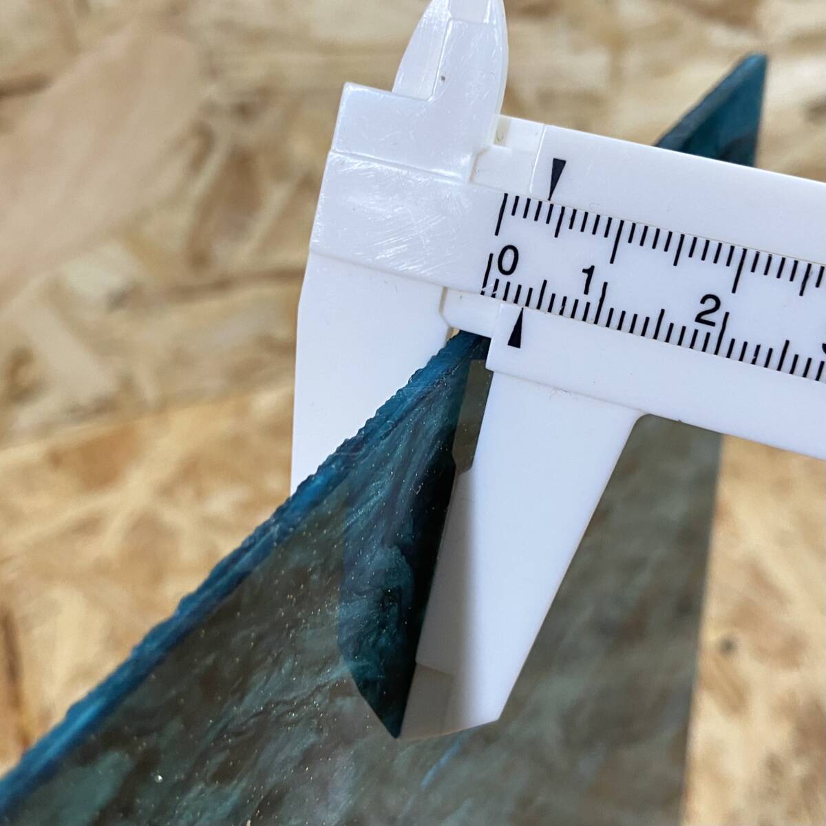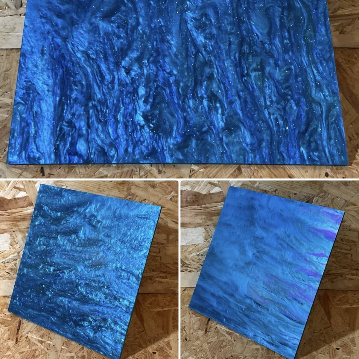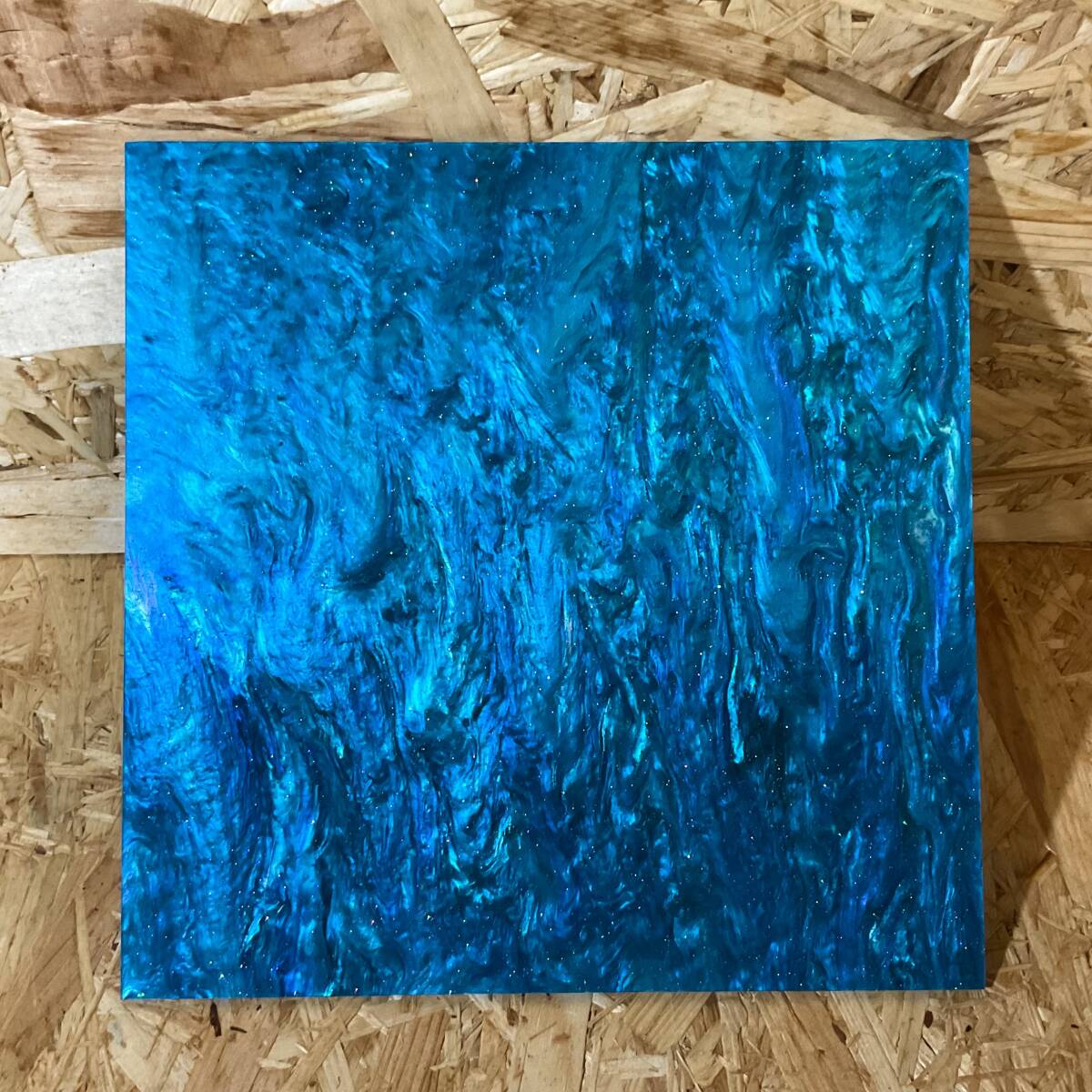 柄物のアクリルパール板です。表裏の柄は製造過程により模様の出方が違います。とっても鮮やかなエメラルドブルーの流雲柄です。もう方側はパールの面積多く雰囲気の違った模様になります。角度によりアワビや真珠貝の様に色の変化が見られ、プレート表面はフラットですが立体感の感じられる柄になっています。画像では青が強く出てグリーンのマーブルが目立っていませんが、実際はもう少しグリーンよりの深みのある深海色です。