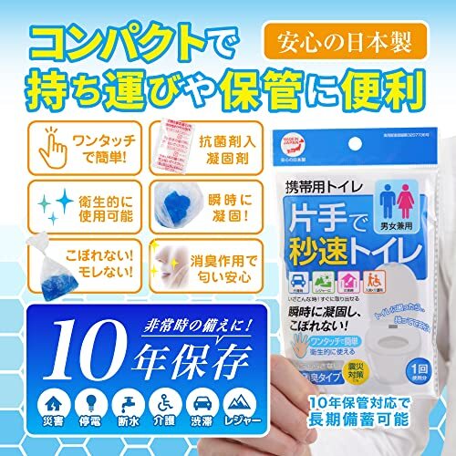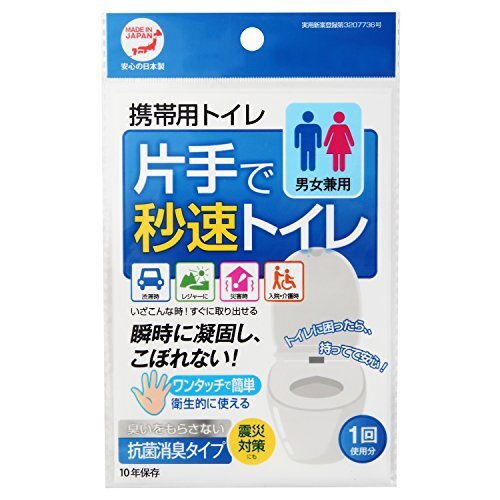 商品説明 | 抗菌 消臭 タイプの携帯トイレ。袋が長いから結びやすく、跳ね返りも少ない設計。 緊急用としていつでも携帯できるトイレです。災害用備蓄品としてもお使い頂けます。10年保存。ご購入より10年間保存可能とさせていただいておりますが、常温で直射日光のあたらないところで保管いただけましたら10年以上経過した後も使用可能です。製造日等の記載はございません。 あくまで目安として10年と記載させていただいておりますので何卒宜しくお願い致します。 抗菌剤入り凝固剤で直ぐに固まり、モレや匂いに安心の設計です。 男性 女性 大人 子供 を問わず片手でご使用できます。ワンタッチで簡単に使用できます。利用シーン: ドライブ レジャー 災害 介護 登山 アウトドア キャンプ 旅行 携帯用トイレ 救急用 救急トイレ 緊急トイレ 携帯トイレ 非常用トイレ 清潔 簡単 男女使用可 非常用 緊急用 応急用 介護用 防災 片手で秒速トイレ 日本製 【男女兼用 大便・小便使用OK】【災害用 携帯トイレ 非常用トイレ】 【ご使用方法】 ?本体に折り畳んである袋を伸ばして付属の凝固剤(粉末)を投入します。 ?親指と中指で半円切り込み部分を押さえ形を整えてご使用下さい。 ?ご使用後は紙台紙を外し、本体袋の口をしばり、付属の黒色廃棄用袋に入れて捨てて下さい。 【使用上の注意】 ・本品は1回の使い切りとなります。(約400cc目処) ・尿がない場合は凝固剤は固まりません。 ・凝固剤は食べ物ではありません。誤って食べたり飲んだりしないでください。 ・凝固剤が皮膚や衣服に付着した場合は速やかに水で洗い流してください。 ・万一凝固剤を飲み込んだ場合は直ぐに吐かせ、また、皮膚に付着して肌に異常があれば、医師の診断を受けてください。 ・直射日光や高温多湿の場所を避け保管し、乳幼児の手の届く所に放置しないでください。 ・小さなお子様が使用される場合は必ず保護者が立会い安全を確認してください。 ・本来の用途以外には使用しないでください。 ・お住まいの自治体の定める分別区分に従って廃棄してください。 【材質】ポリエチレン・紙(本体)・高級水性樹脂・無機系抗菌剤(凝固剤)・ポリエチレン(廃棄用袋) ■ご注文からお届けまで ※トラブル防止のため入札、落札前に必ずご一読をお願い致します。 落札後のお客様都合でのキャンセルはお受けできませんので、予めご了承ください。 1.ご注文 : ご注文は24時間受け付けております。 2.注文確認 : ご注文時、オーダーフォーム等必要事項を入力お願い致します。 3.入金確認 : 前払い決済をご選択の場合、ご入金確認後、配送手配を致します。 4.出荷 : 配送準備が整い次第、出荷致します。配送業者、追跡番号等の詳細をご連絡致します。 5.到着 : 出荷後、1-3日で商品が到着します。 ※商品の到着までは、決済確認後、3-7営業日でお届けとなります。 ※離島、北海道、九州、沖縄は遅れる場合がございます。ご了承下さい。 ※代引の場合、手数料として660円頂きます。 商品管理、在庫管理は行っておりますが、商品の不具合等でお届け出来ない場合は、 銀行口座へ振込返金となりますので、予めご了承いただきますようお願い申し上げます。 手続き削減の為、こちらからは発送完了までご連絡を行なっておりません。 原則、電話対応はしておりませんので、ご質問等はお問い合わせ、またはメールにてお願い致します。 土日祝祭日はご質問や落札されても商品発送等の、対応ができない日もございます。 予めご了承ください。 |