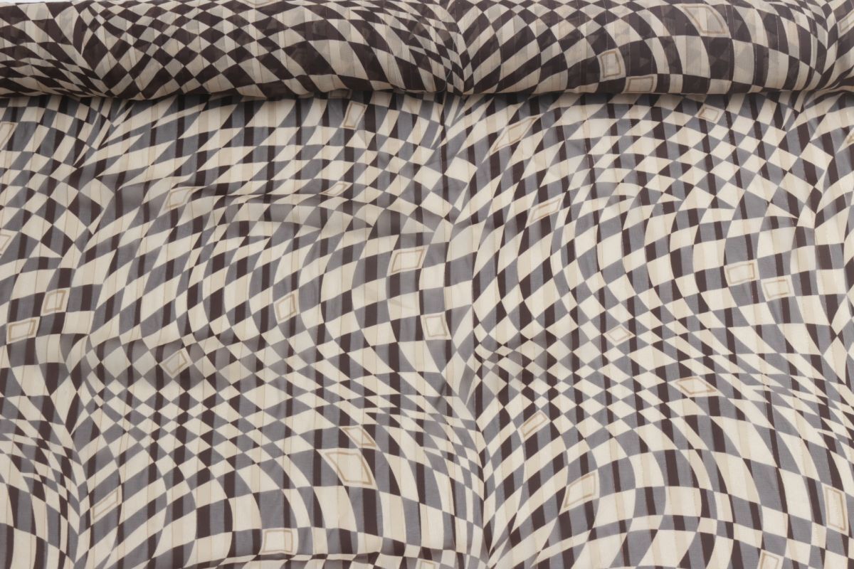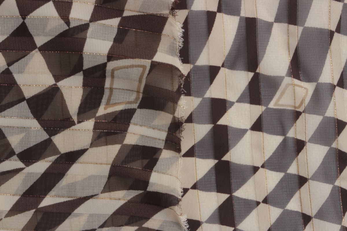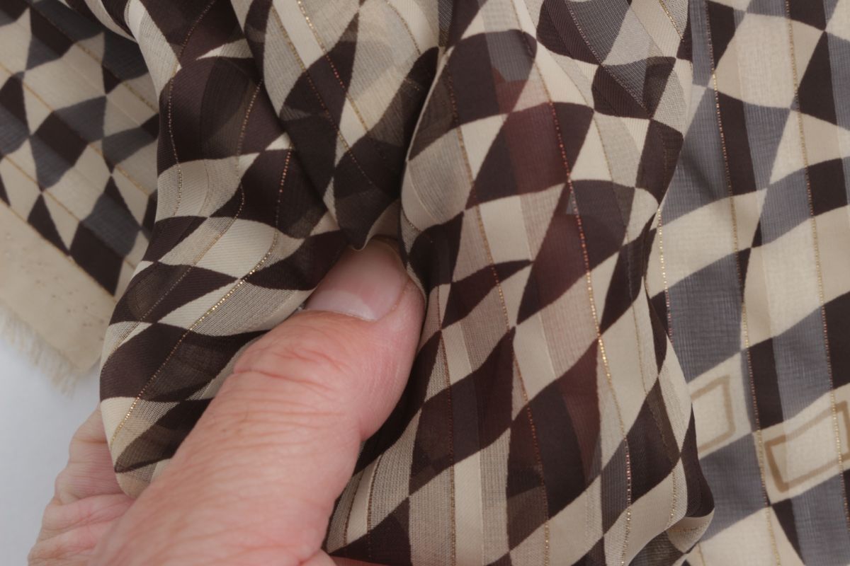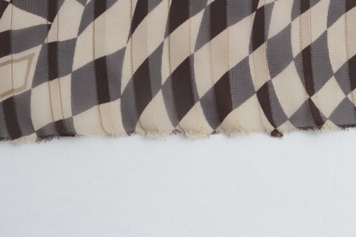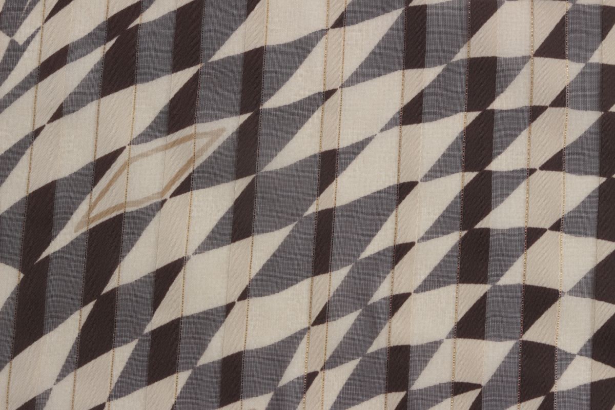 商品説明:厚さ:やや薄手・透け感のあるポリエステルボイル(強撚)でドライ感のあるシフォンに幾何学模様です。サラッとして綺麗なドレープ性のある素材です。ブラウス、シャツ、ワンピース、スカート、パンツなどに。お手入れも簡単でしわになりにくい素材です。