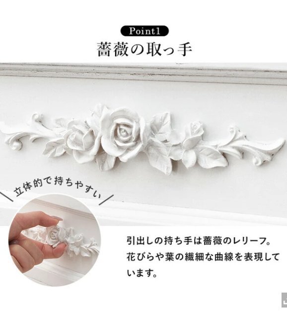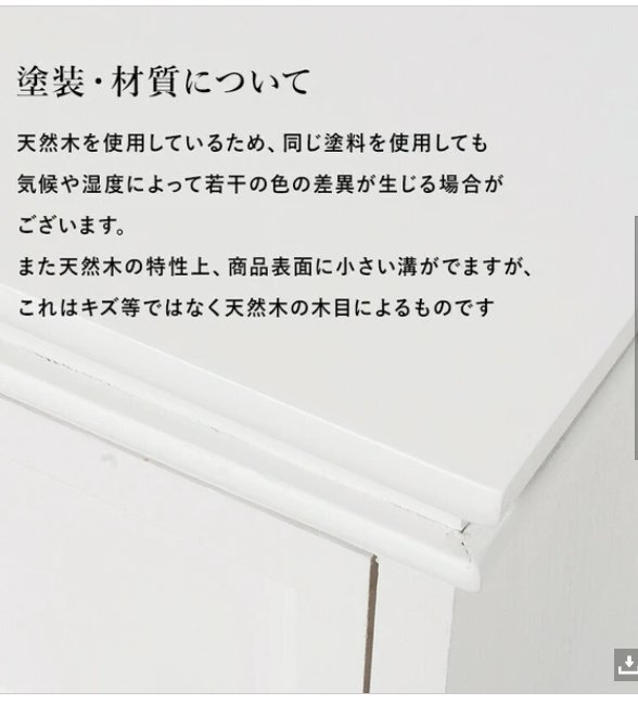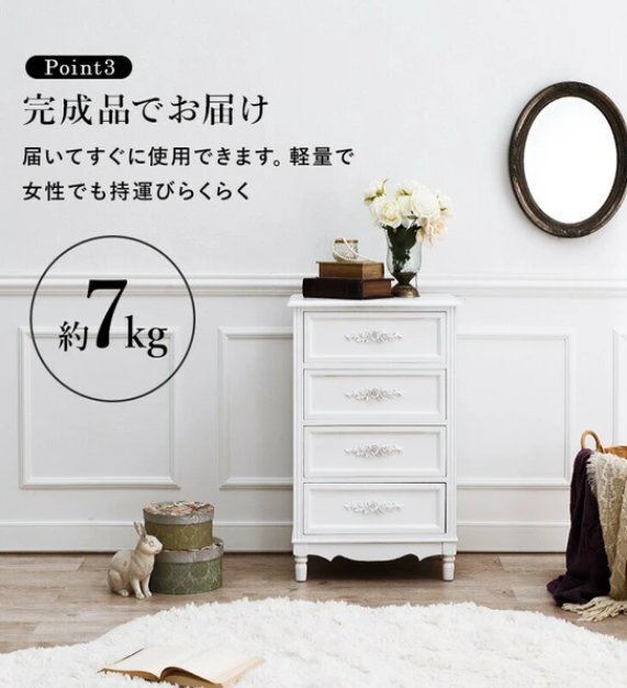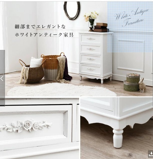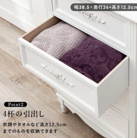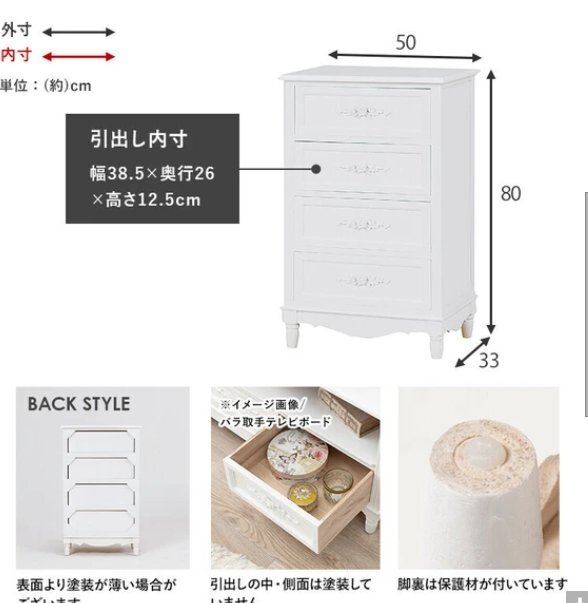 下記よくお読みの上お願いします。在庫変動しますのでご注文前に必ず在庫のお問い合わせをおねがいします。送料無料離島沖縄北海道は別途お見積りです。廃盤の場合を除き理由の如何にかかわらずキャンセルはできません。コロンとした脚と繊細な浮き彫りが上品なチェスト。【WOOD PRODUCTS】様々なライフスタイルに寄り添う木製家具シリーズ。■本体サイズ:(約)幅50×奥行33×高さ80cm■ 引出内寸:(約)幅39×奥行26×深さ12cm■完成品下記よくお読みのうえお願いします。 他サイトでも販売しておりますので、タイミングによっては完売となっている場合がございます。 入札前に在庫の確認を質問欄からお願します。 ご質問ないまま落札され、決済をされた後、在庫がなくお届けできない場合は決済手数料を引いてのご返金となります旨あらかじめご了承くださいませ。