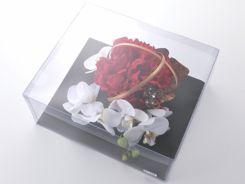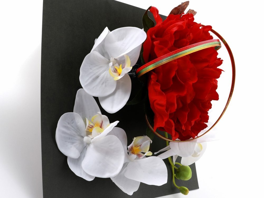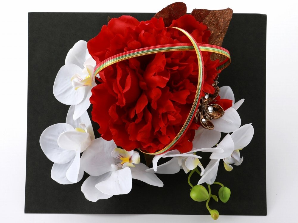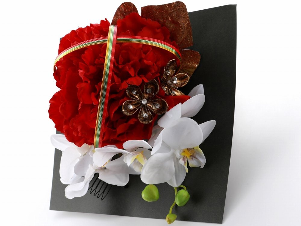 ボリュームたっぷりの赤のお花飾りに、金の花・葉と胡蝶蘭が付いています