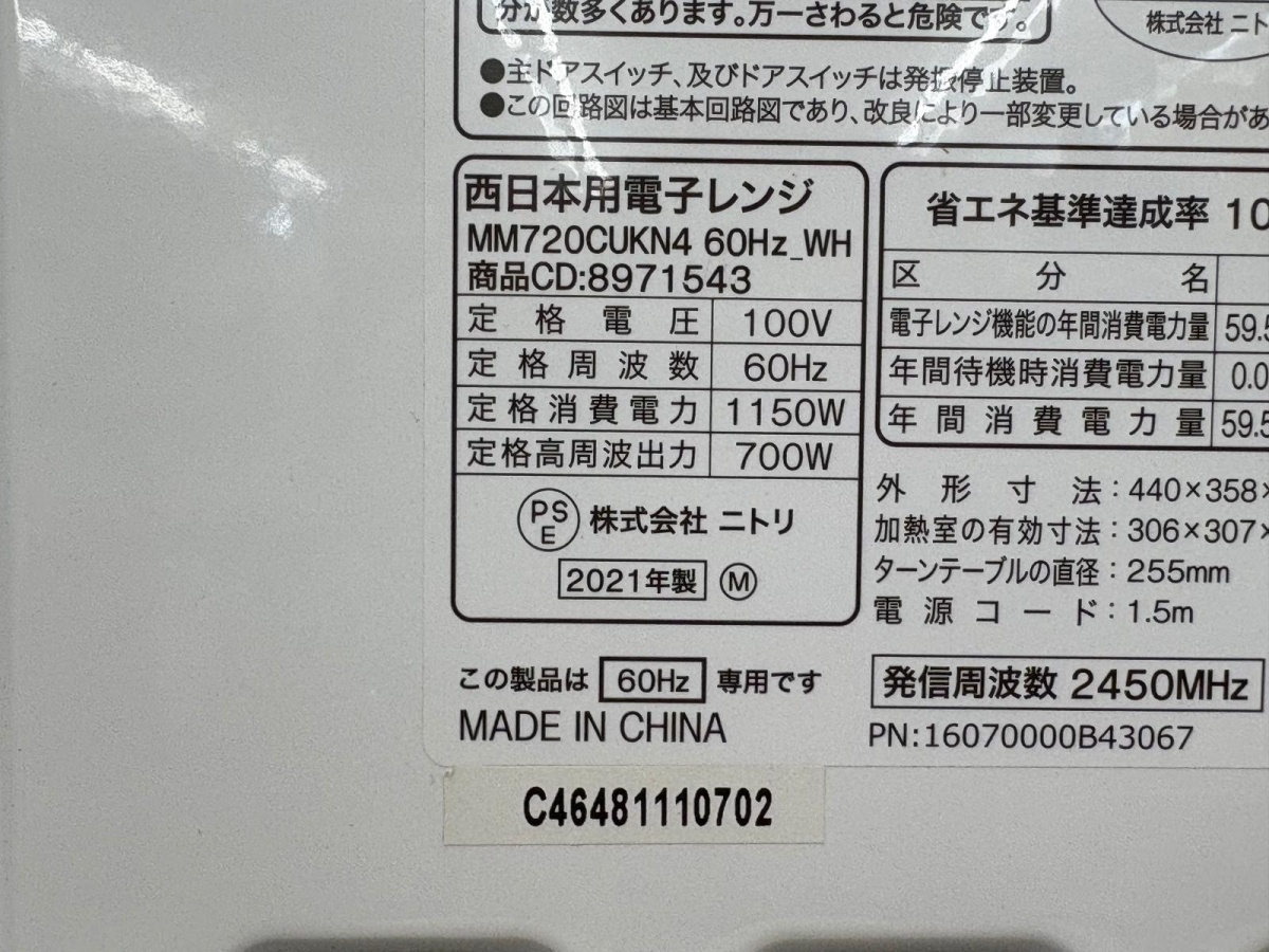 【中古品】ニトリ 電子レンジ MM720CUKN4の出品です。